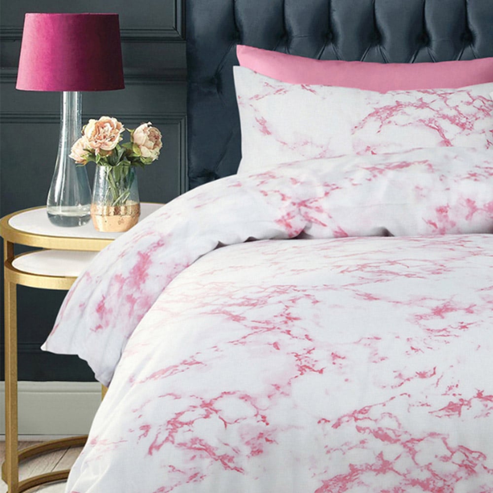 Transform your bedroom into a tranquil retreat with this Velosso Double Pink Marble Effect Duvet Set. Made from easy-care polycotton, this duvet set includes one duvet cover and two pillowcases. An elegant choice to elevate your bedroom decor effortlessly. This double duvet set brings a touch of sophistication with its soft pink hue and mesmerizing marble pattern so you can indulge in comfort and style as you drift off to sleep enveloped in its luxurious embrace.