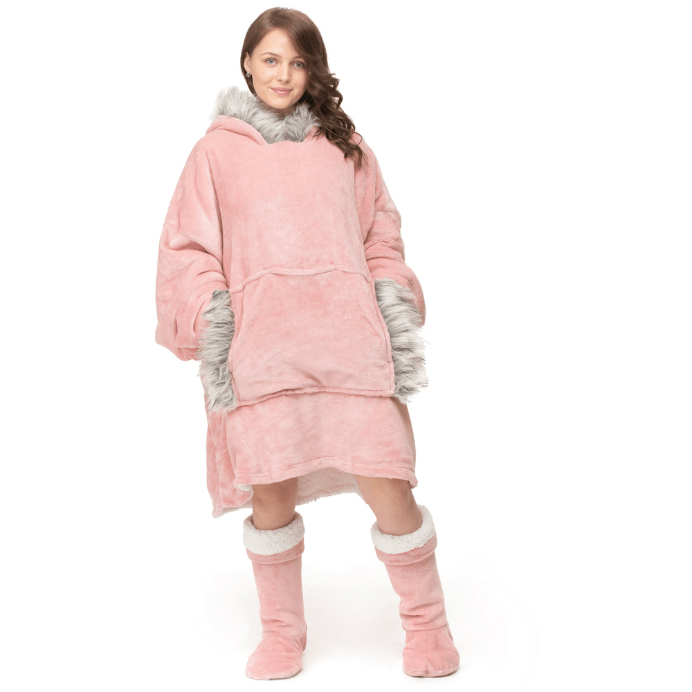 Enhance your winter wardrobe essentials with the Velosso Fur Trim Hoodie Oversize Blush Pink. It is crafted using thermal fabric with a sherpa lining to keep you warm during the winter season. This oversized hoodie features a large hood with elasticated cuffs and a two-sided kangaroo pocket. It also has fur trim on the hood and the kangaroo pocket for protection against the harsh weather. This hoodie is ideal for snuggling while relaxing, travelling or camping purposes. This cosy and stylish hoodie is an ideal gift option for your loved ones. It effortlessly blends with all types of contemporary and classic clothing styles.