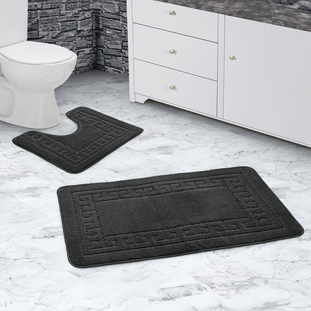 Give your bathroom a stylish upgrade with the Greek Key Bath Set. This set, which includes a bath mat and matching contour rug, brings a touch of classic elegance to your space. Made from 100% polypropylene, the top of the set is soft and comfortable underfoot. The geometric Greek key design adds a beautiful, eye-catching look that fits any bathroom style. For safety, the bottom has a latex backing that prevents slipping, so you don’t have to worry about accidents when stepping out of the shower or bathtub. Cleaning is easy — just throw it in the washing machine, and it will stay fresh, clean, and maintain its softness and colours
