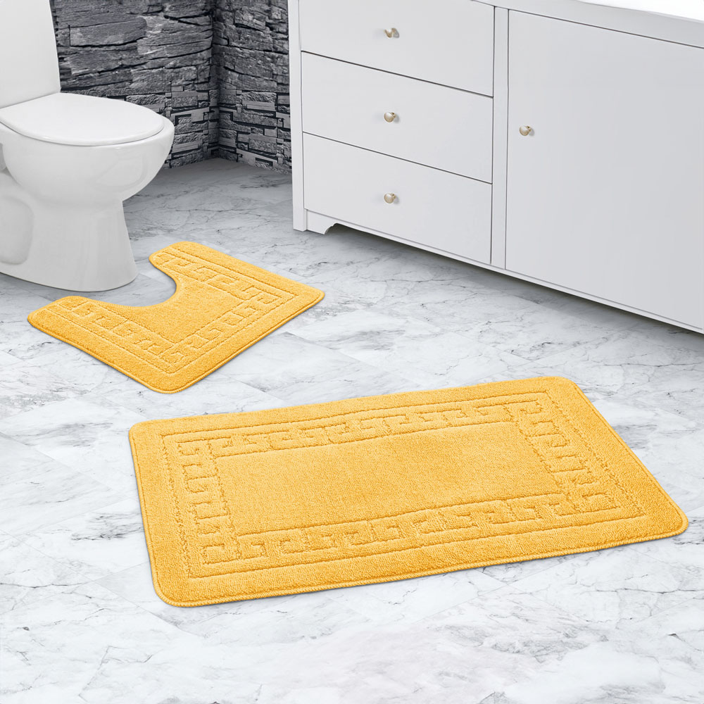 Give your bathroom a stylish upgrade with the Greek Key Bath Set. This set, which includes a bath mat and matching contour rug, brings a touch of classic elegance to your space. Made from 100% polypropylene, the top of the set is soft and comfortable underfoot. The geometric Greek key design adds a beautiful, eye-catching look that fits any bathroom style. For safety, the bottom has a latex backing that prevents slipping, so you don’t have to worry about accidents when stepping out of the shower or bathtub. Cleaning is easy — just throw it in the washing machine, and it will stay fresh, clean, and maintain its softness and colours