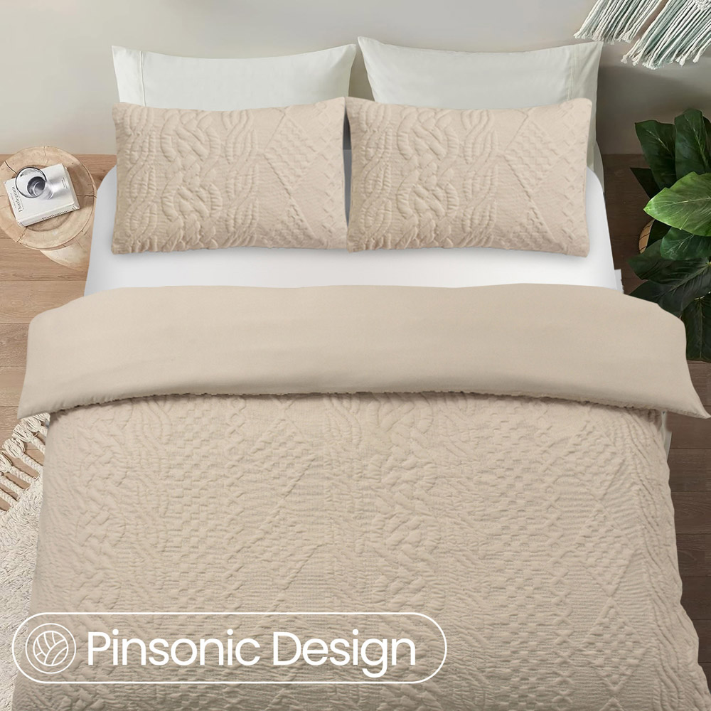 Transform your bedroom into a cosy haven with a soft quilted knit duvet set in a chic beige tone, featuring a chunky 3D embossed pattern that brings both texture and contemporary style to your space. You'll love how the easy-care fabric makes life simpler, as it's machine washable and durable enough for everyday comfort. Matching pillowcases complete the look, creating a unified and inviting atmosphere that's perfect for winter or any season when you want to feel snug.