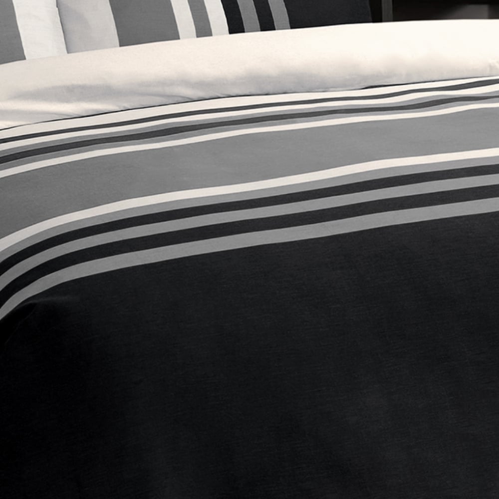 Enhance your bedroom ambience with a seamless blend of modern aesthetics and comfort using this Velosso Double Black Tonal Stripe Duvet Set. Made from easy-care polycotton, this duvet set includes one duvet cover and two pillowcases. It sports a charming tonal stripe design and helps enhance both style and functionality. While the button closure adds a touch of sophistication, ensuring your duvet remains securely in place throughout the night so you can get a good night's sleep.