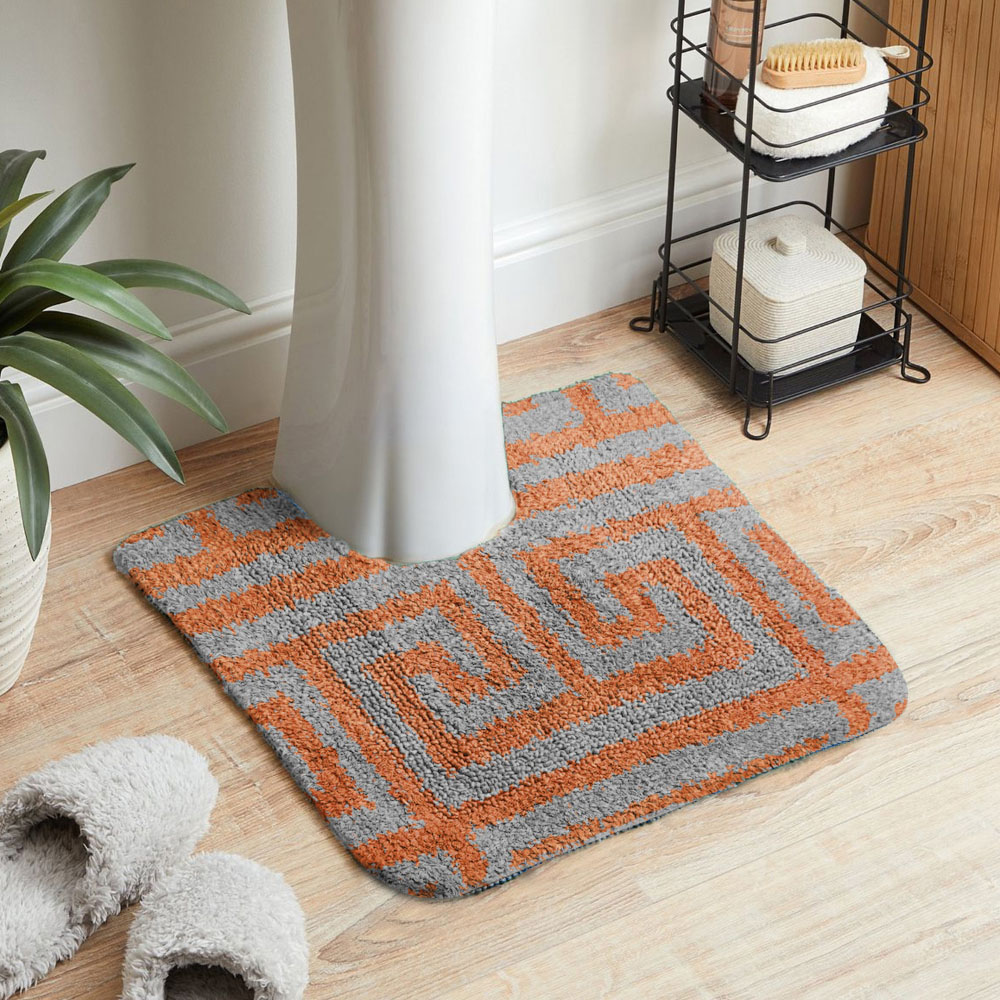 Add style and practicality to your bathroom with Velosso Luxe 2 Piece Orange Bath Set. This modern set includes a soft bath mat and a matching rug for extra comfort. Made from polypropylene, it’s gentle on your feet, with a classic Greek key design that brings a touch of elegance. The non-slip latex backing keeps the rugs securely in place to prevent falls. The Luxe Bath Set is machine-washable, so it's easy to keep clean. Plus, it meets high safety standards to ensure it's free from harmful chemicals, making it safe for your family. Enjoy the luxury and comfort this set brings to your bathroom.