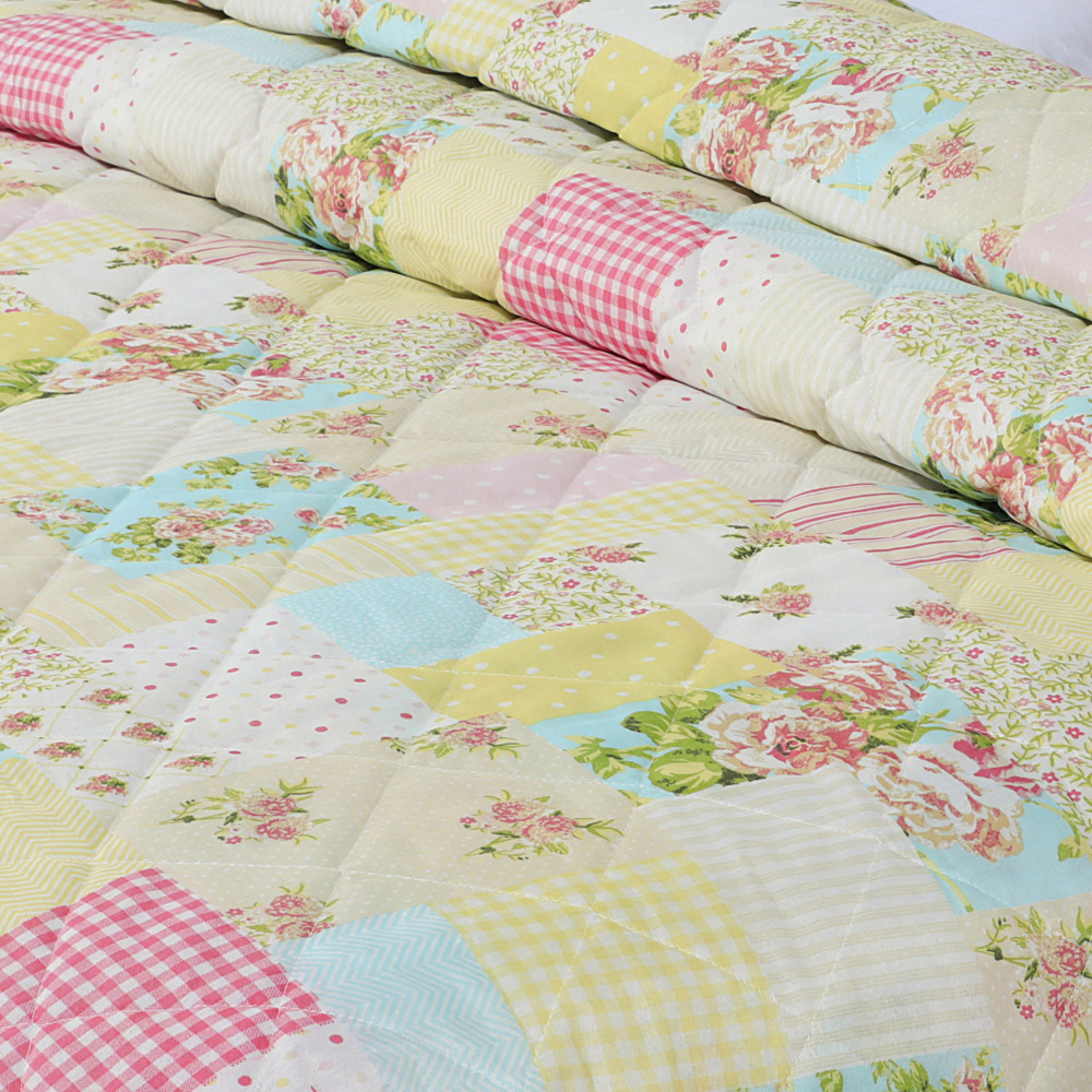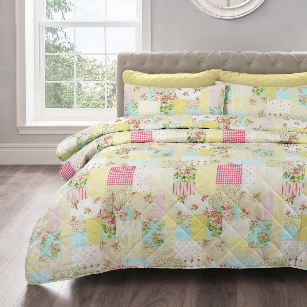 Upgrade your sleep sanctuary with the Velosso Single Candice Patchwork Bedspread Set. The set offers a perfect balance of comfort and style for your bedroom. Its lightweight design ensures year-round usability, providing warmth on cooler nights and breathability during warmer seasons. The bedspread set is made from a blend of polycotton fabric, seamlessly combining cosy comfort with timeless elegance. The reverse side, made from 100% polyester, adds an extra layer of softness for a luxurious sleep experience. The floral patchwork design in shades of red, pink, yellow, and blue creates a rustic yet serene ambience reminiscent of a flourishing garden in full bloom. The set includes a beautifully quilted bedspread and a matching pillowcase featuring intricate stitching and plush texture for an inviting and aesthetically pleasing look. Easy to maintain, the set is machine washable. Elevate your bedroom's ambience with this set and transform it into a picturesque haven of warmth and tranquillity.