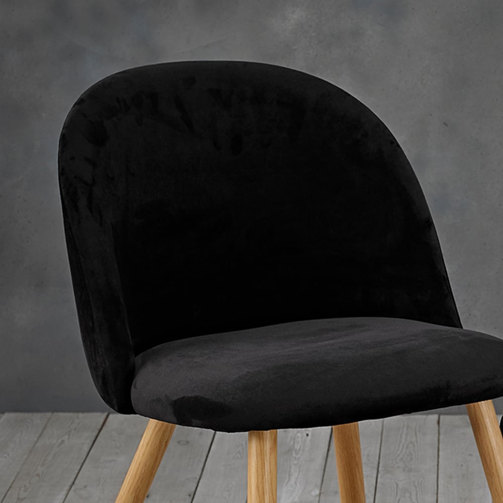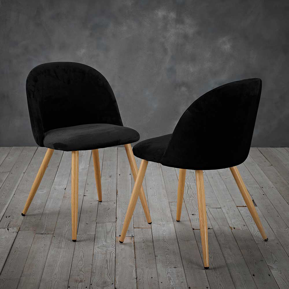 The Venice dining chair, available in a set of two, is crafted from luxurious black velvet. It features metal legs with an oak effect, creating a stunning contrast against the deep-coloured seat. The plush fabric not only adds comfort but also exudes sophistication, making it a perfect addition to any modern interior.