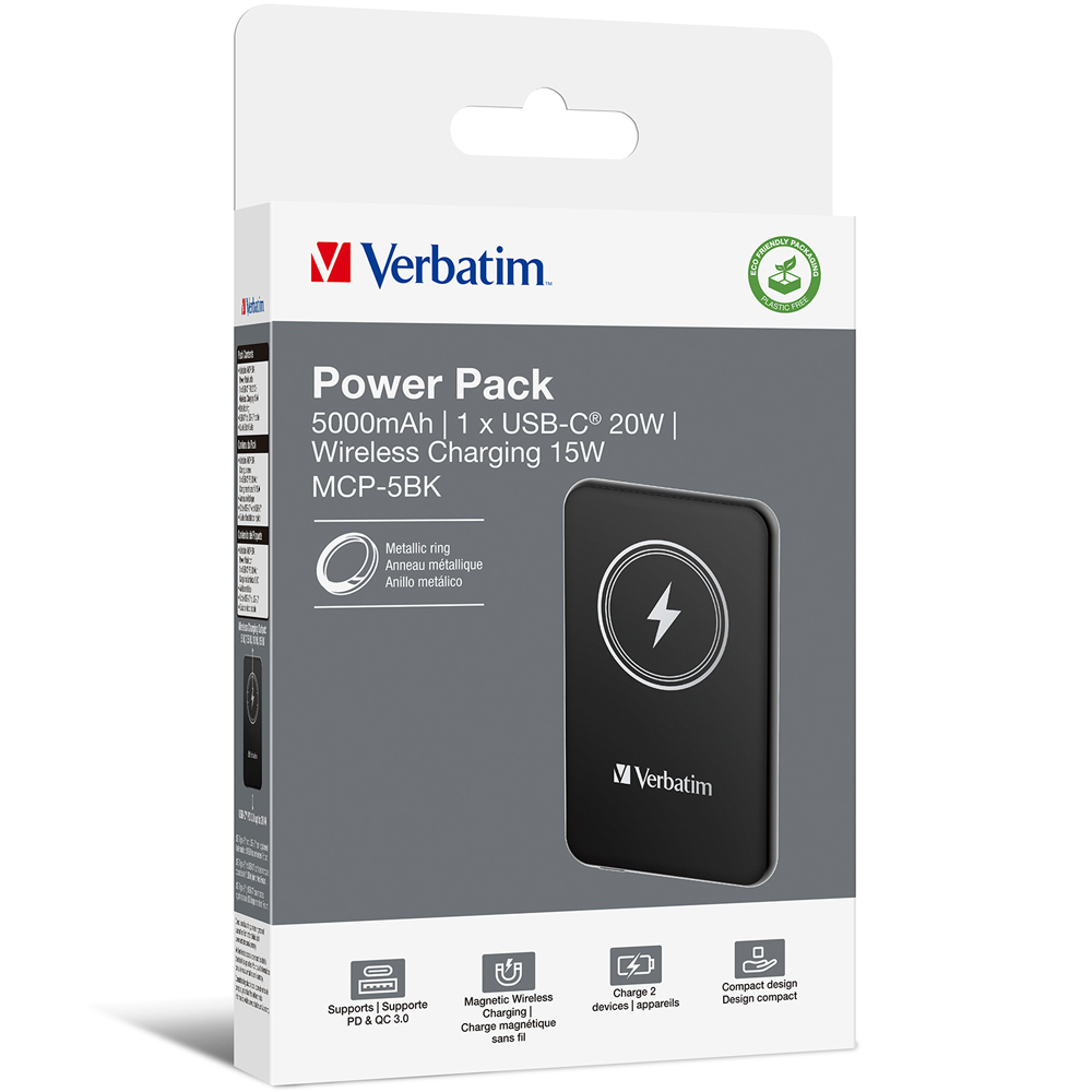 Keep your electronic devices powered up with the Verbatim Charge N Go Magnetic Wireless Power Bank Black 5000mAh. Boasting a sleek and versatile design, this power bank features 15W magnetic wireless charging and PD20W capabilities, ensuring fast and efficient charging for all your devices. The magnetic attachment allows for easy snap-fixing to your phone, enabling wireless charging on the go. With a slim and portable design, it easily fits into your pocket or purse. Additionally, the power bank offers overcharge protection, a convenient LED power status indicator, and bi-directional fast charging and discharging with its Type-C port. Sleek and compact with a thickness of only 9.6mm, this power bank is a perfect blend of style and functionality for your daily adventures.