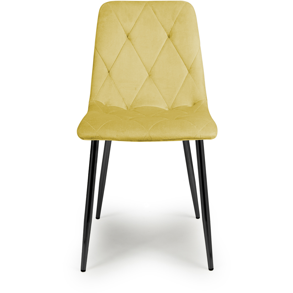 Add a touch of elegance to your dining space with the Vernon Mustard Brushed Velvet Dining Chair. A gently sloped contemporary dining chair, upholstered in yellow brushed velvet fabric. The comfortably contoured seat and back feature attractive diamond panel pleated stitching. Fitted with cross-frame black metal legs. Assembly is required. These chairs are sold in boxes of four. The grey brushed velvet upholstery and diamond panel pleated stitching add a luxurious and sophisticated look, while the contoured seat and back provide a comfortable seating experience.