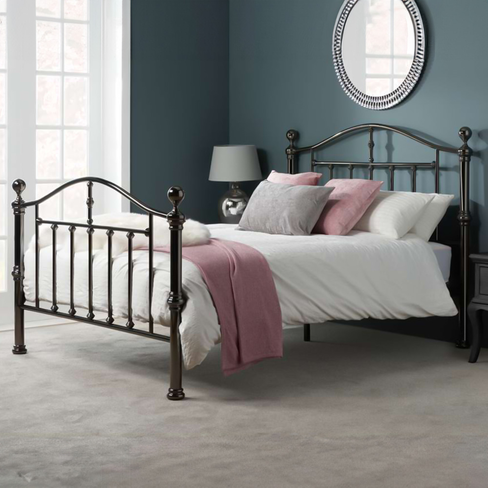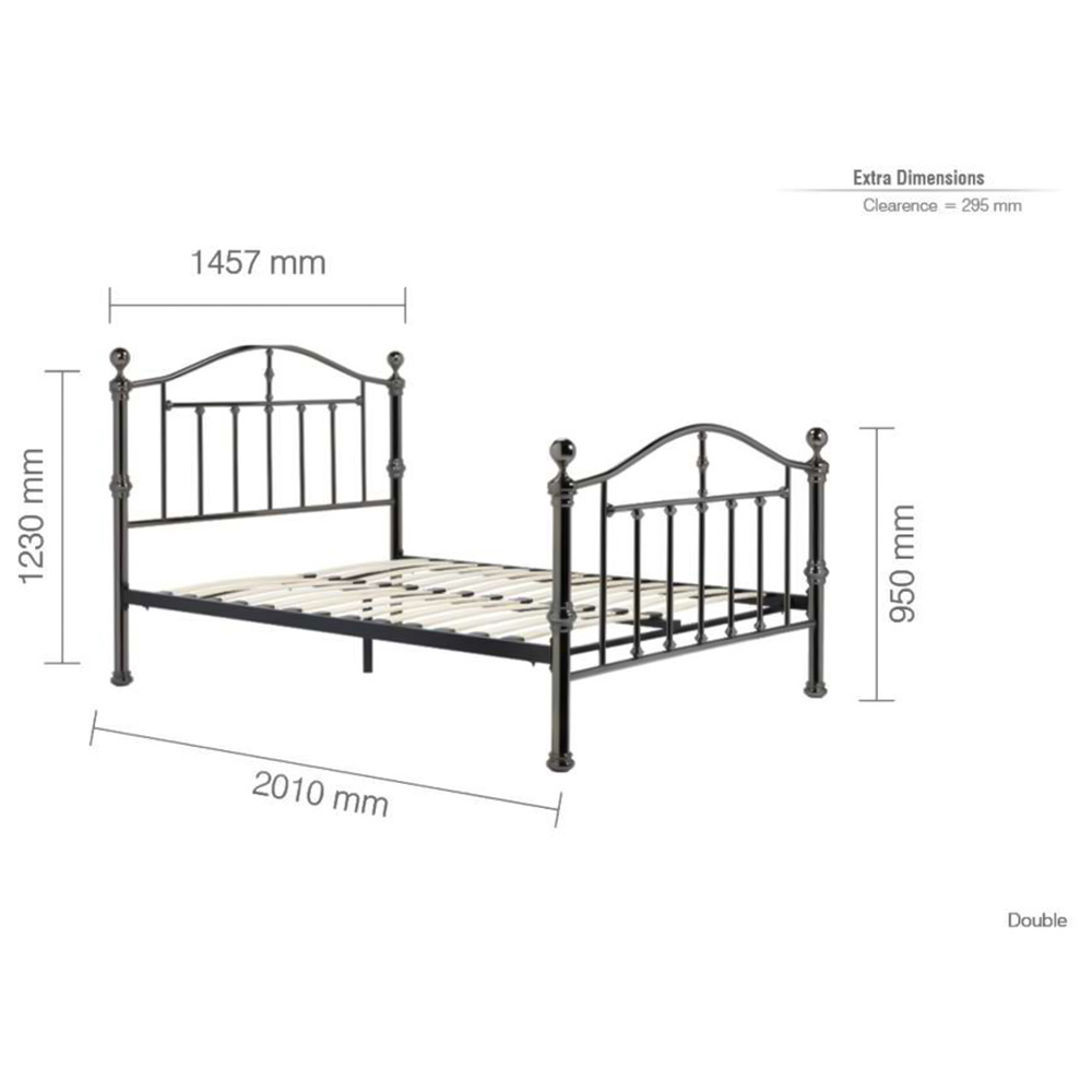 Introduce a timeless and elegant touch to your living space by incorporating the Victoria Black Double Bed Frame. Constructed from steel and adorned with a sophisticated black nickel coating, this bed frame features black side rails for added style. With a sprung slatted base, it offers a natural bounce that conforms to pressure points, ensuring maximum comfort. The steel bed boasts a classic design with a polished finish that accentuates its intricate structure. Supporting a weight capacity of up to 220 kg, this bed frame is compatible with UK standard size mattresses.