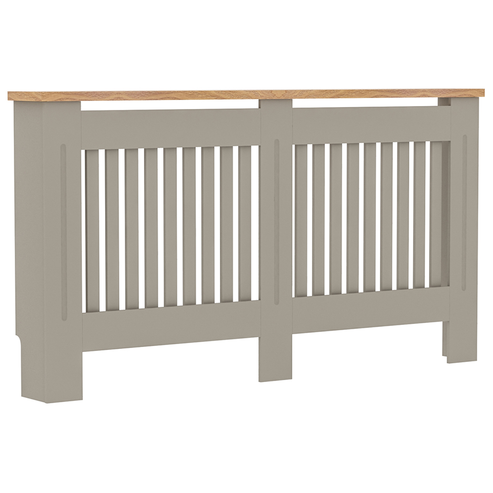 The Vida Arlington Large Radiator Cover in grey is a chic and practical addition to any home. This sleek and modern radiator cover is designed to not only conceal unsightly radiators but also add an elegant touch to your living space. The stunning grey finish combined with a natural wood top shelf is the perfect blend of contemporary and traditional design. The cover is designed with a vertical slat grill pattern that exudes sophistication and style. The rounded edges of this cover ensure safety and add to the overall aesthetic appeal. Additionally, the top shelf provides an ideal space for displaying decorative items, storing books, or placing photo frames. It's easy to assemble and comes with instructions for hassle-free installation. External Measurements: H 83.3 x W 152 x D 19cm approx. Internal Measurements: H 81 x W 145 x D 16cm approx.