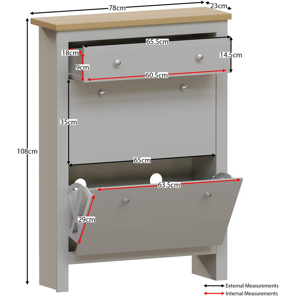Introducing the Vida Designs Arlington Grey Shoe Cabinet, designed to help you keep your footwear organised and easily accessible. With its ample storage space and durable construction, this shoe cabinet is the perfect addition to any home. Featuring two doors for shoe storage and one drawer for additional storage space, this cabinet is perfect for keeping your footwear and accessories organised and out of sight. Also, the shaker style adds a touch of elegance to any room, while its grey and oak finish complements a wide range of decor styles. Crafted from high-quality MDF and particle board, this shoe cabinet is built to last and withstand the wear and tear of daily use. Plus, the versatile design of this cabinet allows it to be used in various settings, making it the perfect solution for anyone looking to keep their footwear organised and easily accessible. Please Note: This item requires self-assembly with easy-to-follow instructions provided. The actual colour of the product may vary slightly as your screen display setting and lighting with your home environment may differ from our own. Weight Limit: 5kg per shelf and 5kg per drawer.