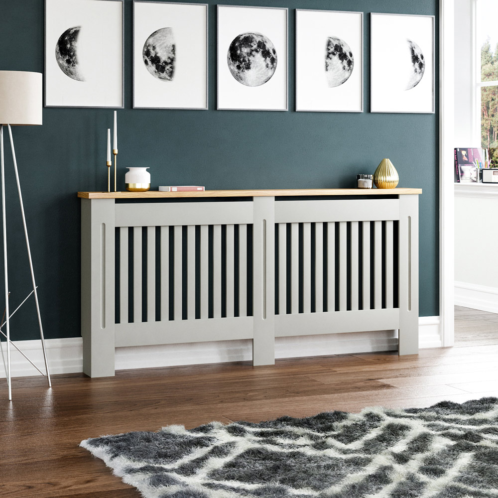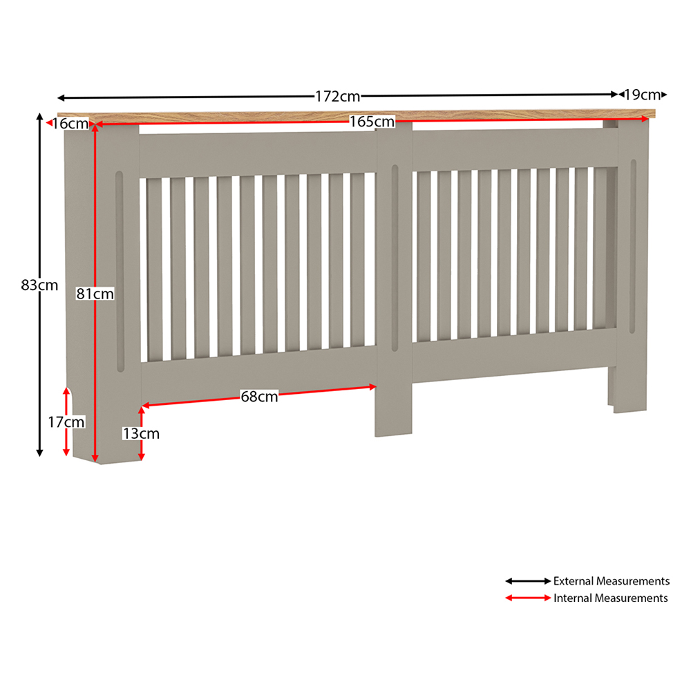 The Vida Arlington X-Large Radiator Cover in grey is a chic and practical addition to any home. This sleek and modern radiator cover is designed to not only conceal unsightly radiators but also add an elegant touch to your living space. The stunning grey finish combined with a natural wood top shelf is the perfect blend of contemporary and traditional design. The cover is designed with a vertical slat grill pattern that exudes sophistication and style. The rounded edges of this cover ensure safety and add to the overall aesthetic appeal. Additionally, the top shelf provides an ideal space for displaying decorative items, storing books, or placing photo frames. It's easy to assemble and comes with instructions for hassle-free installation. External Measurements: H 83.3 x W 172 x D 19cm approx. Internal Measurements: H 81 x W 165 x D 16cm approx.