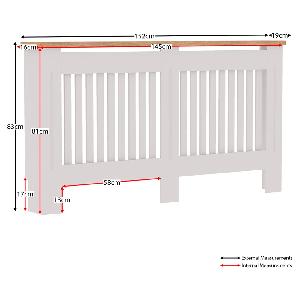 The Vida Arlington Large Radiator Cover in grey is a chic and practical addition to any home. This sleek and modern radiator cover is designed to not only conceal unsightly radiators but also add an elegant touch to your living space. The stunning white finish combined with a natural wood top shelf is the perfect blend of contemporary and traditional design. The cover is designed with a vertical slat grill pattern that exudes sophistication and style. The rounded edges of this cover ensure safety and add to the overall aesthetic appeal. Additionally, the top shelf provides an ideal space for displaying decorative items, storing books, or placing photo frames. It's easy to assemble and comes with instructions for hassle-free installation. External Measurements: H 83.3 x W 152 x D 19cm approx. Internal Measurements: H 81 x W 145 x D 16cm approx.