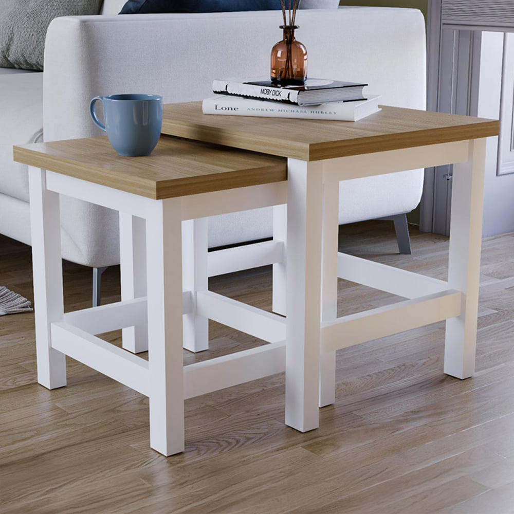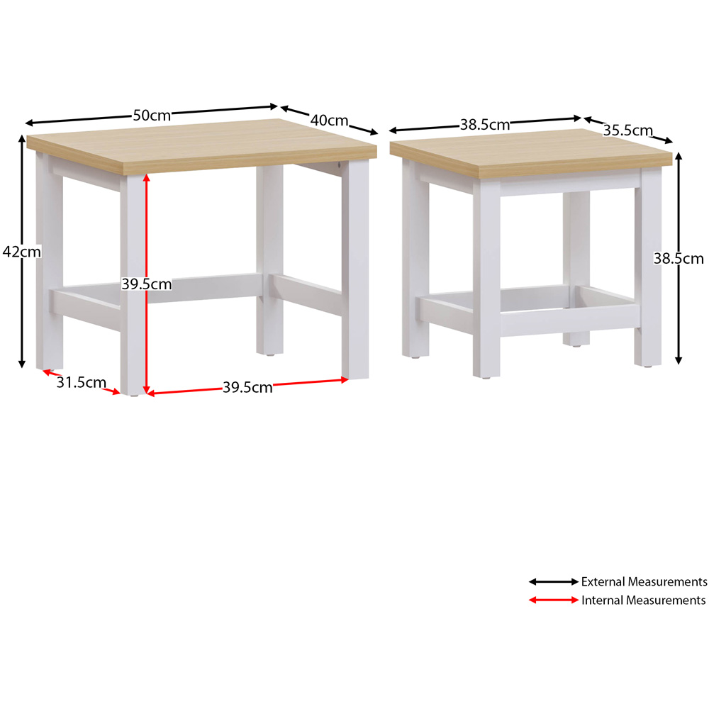 Elevate your living space with the Vida Designs Arlington White Nest of Tables Set of 2. These versatile tables are perfect for adding functionality and aesthetics to your living space. Crafted with meticulous attention to detail, the tables showcase the classic Shaker design with its clean lines, sleek surfaces, and simple yet elegant structure. Stylish and chic, the tables exude a sense of understated sophistication that complements any interior décor. The set includes two tables of different sizes, allowing you to arrange them together or use them separately in various areas of your home. These tables offer the convenience of space-saving nesting, making them perfect for small living spaces or when you need extra surface area when entertaining guests. Each table features a sturdy construction, ensuring long-lasting durability and stability. Also, they are crafted from high-quality materials, guaranteeing that they will withstand everyday use and maintain their beauty for years to come. So, whether you place them in your living room as side tables or in your bedroom as nightstands, the tables will effortlessly blend into any setting. Please Note: This item requires self-assembly with easy-to-follow instructions provided. The actual colour of the product may vary slightly as your screen display setting and lighting with your home environment may differ from our own. Weight Limit: 25kg tabletop, 15kg shelf and 5kg per drawer.
