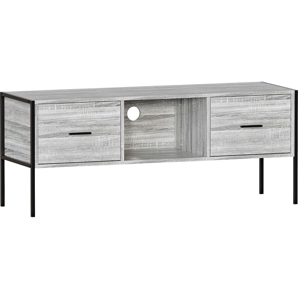The Vida Designs Brooklyn 2 Drawer Single Shelf Grey Industrial TV Unit is a captivating fusion of rugged charm and modern functionality. This TV unit embodies the essence of industrial design, adding a touch of contemporary style to your entertainment area. Crafted with meticulous attention to detail, this TV unit features metal accents and rustic finishes that exude authenticity. The combination of metal and wood creates a compelling look that complements modern, vintage, and eclectic decor themes. The TV unit is designed to accommodate up to a 55-inch TV, providing a sturdy and stylish platform for your entertainment centre. The spacious top surface allows you to showcase your television and add decorative elements to enhance your living space. With two drawers, this TV unit offers convenient storage for your media accessories, remote controls, or other entertainment essentials. The metal drawer pulls add to the industrial charm while providing ease of use. A middle shelf with a cut-out at the back allows for efficient wire management, keeping your cables and cords organized and out of sight. This thoughtful design ensures a clean and clutter-free setup for your entertainment devices. Designed with both style and practicality in mind, the Industrial-Style 2 Drawer TV Unit is perfect for creating a focal point in your living room or entertainment area. Weight Limit: 5kg Per Drawer / 15kg Table Top. Please Note: This item requires self-assembly with easy-to-follow instructions provided. The actual colour of the product may vary slightly as your screen display setting and lighting with your home environment may differ from our own.