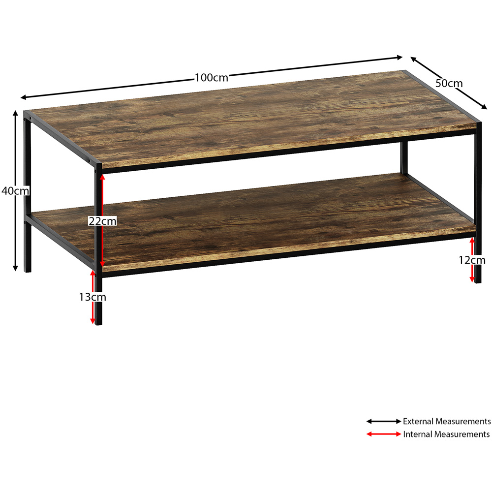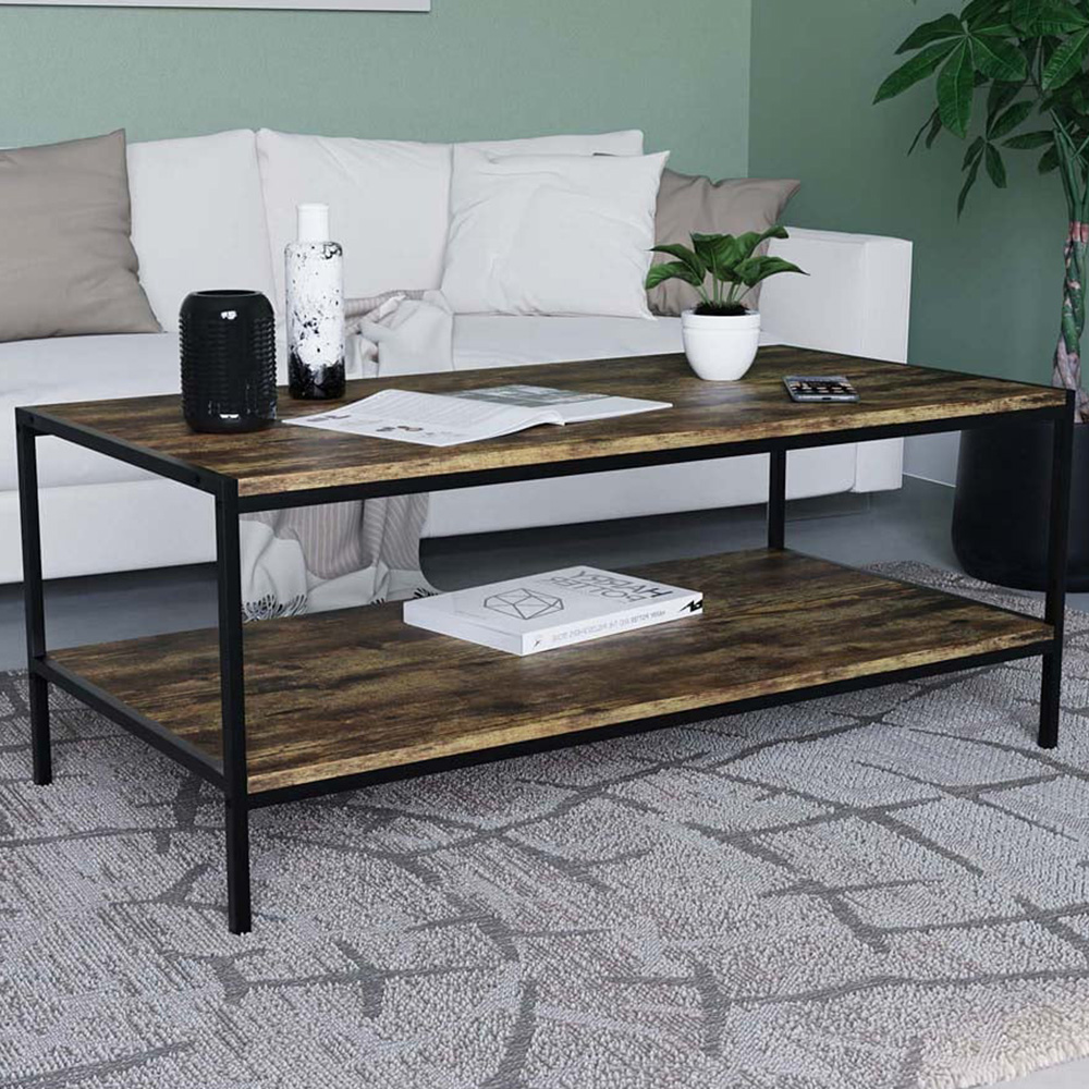 The Vida Designs Brooklyn Dark Wood Rustic Industrial Coffee Table is a captivating centrepiece that seamlessly blends rugged charm with contemporary design. This coffee table embodies the essence of industrial aesthetics, creating a unique and stylish focal point in your living room. Crafted with meticulous attention to detail, this coffee table features metal accents and rustic finishes that exude authenticity. The combination of metal and wood creates a compelling look that complements modern, vintage, and eclectic decor themes. Designed for both style and functionality, this coffee table offers two spacious shelves, providing ample storage and display space for your books, magazines, decor items, or other living room essentials. The open shelving design allows for easy access and adds an air of lightness to the table. With its industrial charm and practical storage features, this coffee table is perfect for both small and large living spaces, bringing character and function to your home. Weight Limit: 15kg Per Shelf. Please Note: This item requires self-assembly with easy-to-follow instructions provided. The actual colour of the product may vary slightly as your screen display setting and lighting with your home environment may differ from our own.