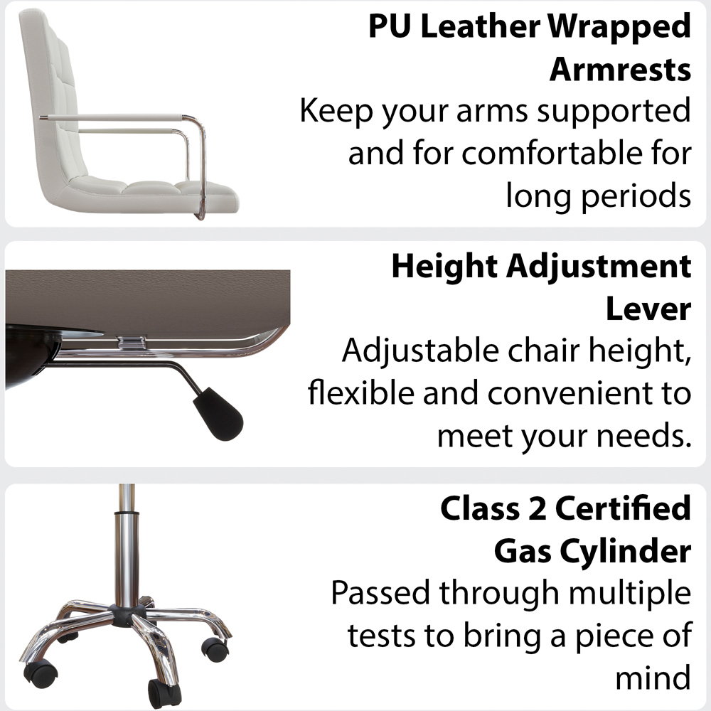 Upgrade your workspace experience with the Vida Designs Calbo White Office Chair. This sleek chair has an exquisite design that is ideal for conference rooms, workstations and home office spaces. The cosy foam-padded seat is upholstered using soft faux leather with a firm backrest for ultimate comfort. This chair has an ergonomic design that supports the back with sturdy armrests and 83 to 90cm adjustable height for your convenience. It also features a 360-degree swivel design with wheels at the base for easy movement and stable support. The maximum weight limit of this chair is 120kg. This product comes with easy-to-follow instructions for self-assembly. Please note: Due to different devices and screen settings, the colour of the webpage picture you see may have a certain colour difference from the actual product. Size: 60 x 60 x 83 - 90cm.