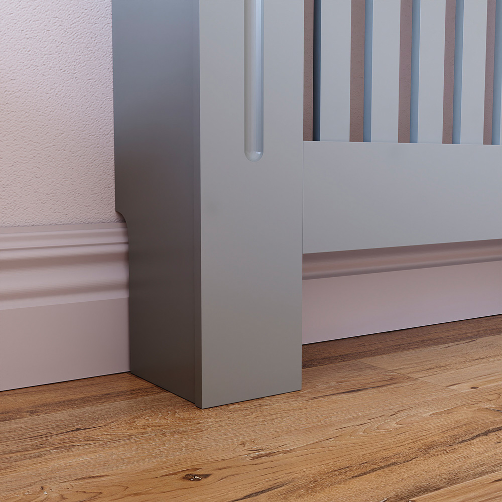 Uplift your living space in a classy way with this Vida Designs Chelsea Grey Extra Large Radiator Cover. This stylish and functional radiator cover has a simple vertical panel pattern design front, enhancing your space's aesthetics. Crafted with meticulous attention to detail, the radiator cover is made from high-quality MDF and finished in powder-coated paint, ensuring durability and stability. It elevates the overall ambience of your living space and allows for optimal heat circulation, ensuring efficient and even distribution of warmth throughout the room. Additionally, the cover serves as a convenient display surface, allowing you to showcase decorative items like photo frames, vases, or small plants, and the weight limit per shelf is five kg. With easy installation and included mounting hardware, setting up this radiator cover is a breeze. It also acts as a safety barrier, protecting against accidental burns and is ideal for households with young children or pets. Please note - The product's actual colour may vary slightly as your screen display setting and lighting with your home environment may differ. Also, please measure your radiator at the widest points to ensure that the internal measurements of the radiator cover are slightly bigger than those of your radiator. External Measurements: H82 x W172 x D19cm and Internal Measurements: H80 x W162 x D16cm.
