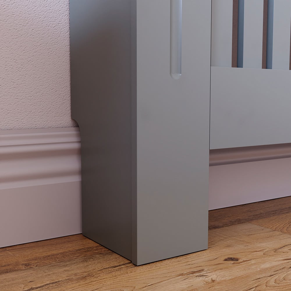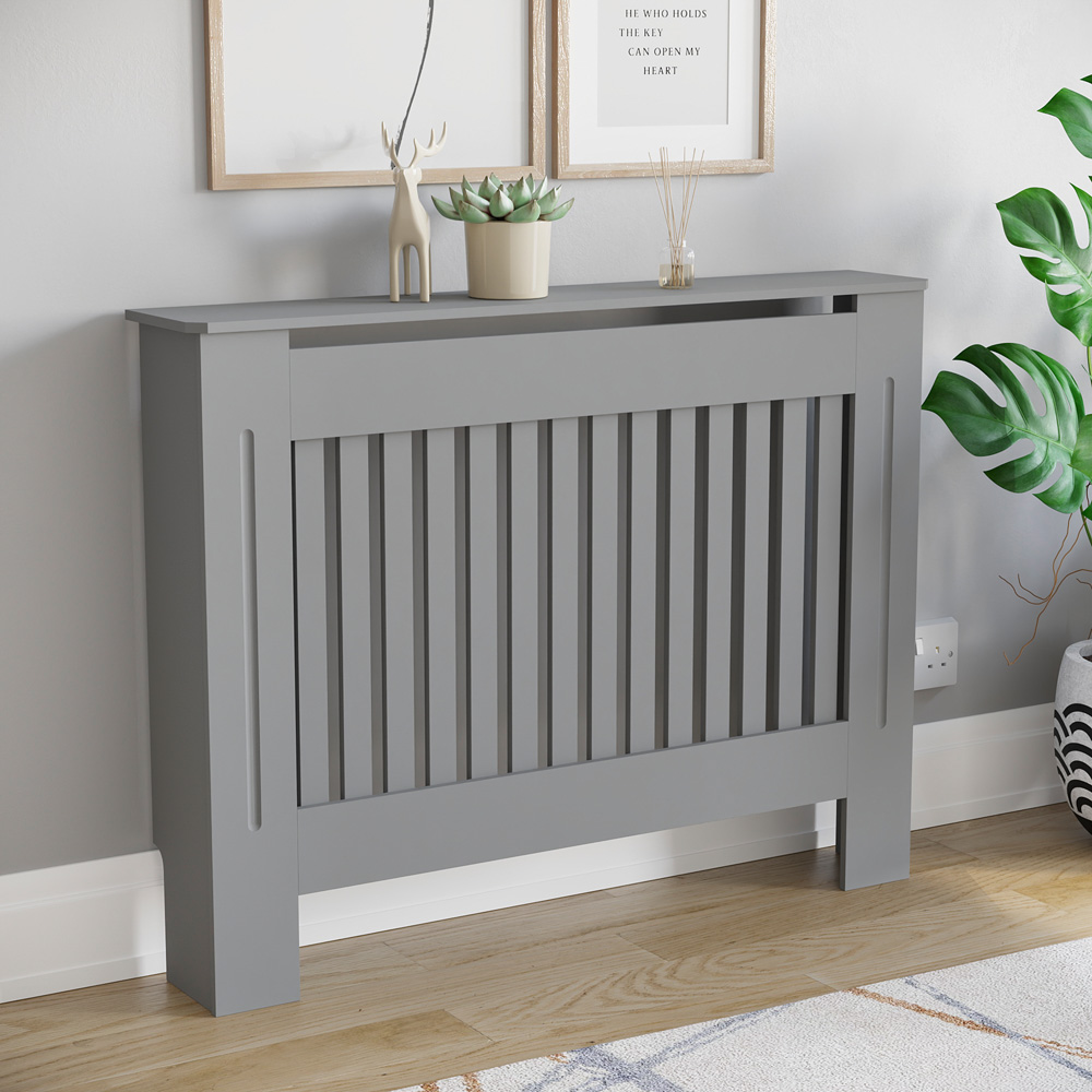 Uplift your living space in a classy way with this Vida Designs Chelsea Grey Medium Radiator Cover. This stylish and functional radiator cover has a simple vertical panel pattern design front, enhancing your space's aesthetics. Crafted with meticulous attention to detail, the radiator cover is made from high-quality MDF and finished in powder-coated paint, ensuring durability and stability. It elevates the overall ambience of your living space and allows for optimal heat circulation, ensuring efficient and even distribution of warmth throughout the room. Additionally, the cover serves as a convenient display surface, allowing you to showcase decorative items like photo frames, vases, or small plants, and the weight limit per shelf is five kg. With easy installation and included mounting hardware, setting up this radiator cover is a breeze. It also acts as a safety barrier, protecting against accidental burns and is ideal for households with young children or pets. Please note - The product's actual colour may vary slightly as your screen display setting and lighting with your home environment may differ. Also, please measure your radiator at the widest points to ensure that the internal measurements of the radiator cover are slightly bigger than those of your radiator. External Measurements: H82 x W112 x D19cm and Internal Measurements: H80 x W102 x D16cm.