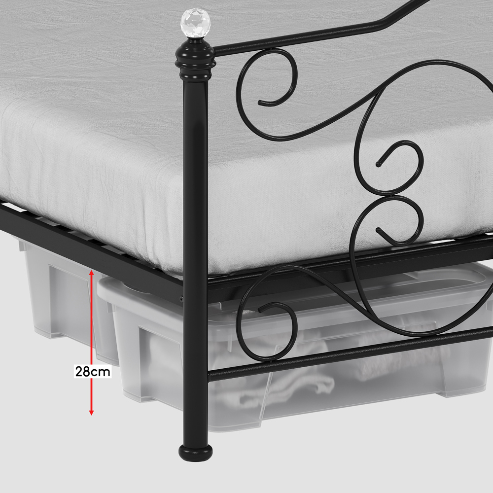 Introducing the Vida Designs Chicago Double Black Metal Bed, a stunning addition to your bedroom. With its open frame design, this bed creates a sense of airy and spacious charm, perfect for any modern or traditional bedroom setting. Crafted with attention to detail, the bed features exquisite crystal finials at each corner, adding a touch of glamour and luxury to the overall design. Designed with both style and practicality in mind, it comes with sturdy metal slats that provide excellent support for your mattress. These slats ensure a stable and comfortable sleep surface, promoting a restful night's sleep. Also, the metal frame construction ensures the bed's durability and longevity, promising years of reliable use. Plus, the sleek and sturdy metal materials add a touch of industrial chic, making this bed a versatile piece that complements various decor styles. Please Note: This item requires self-assembly with easy-to-follow instructions provided. The actual colour of the product may vary slightly as your screen display setting and lighting with your home environment may differ from our own. Additional information: It is recommended that this bed be placed on a carpeted floor, or on a rug. If the bed is placed on a hard floor, such as wood, laminate or tiled, then any movement can cause the frame to slip and this could cause damage to certain components. Weight Limit: 150kg.