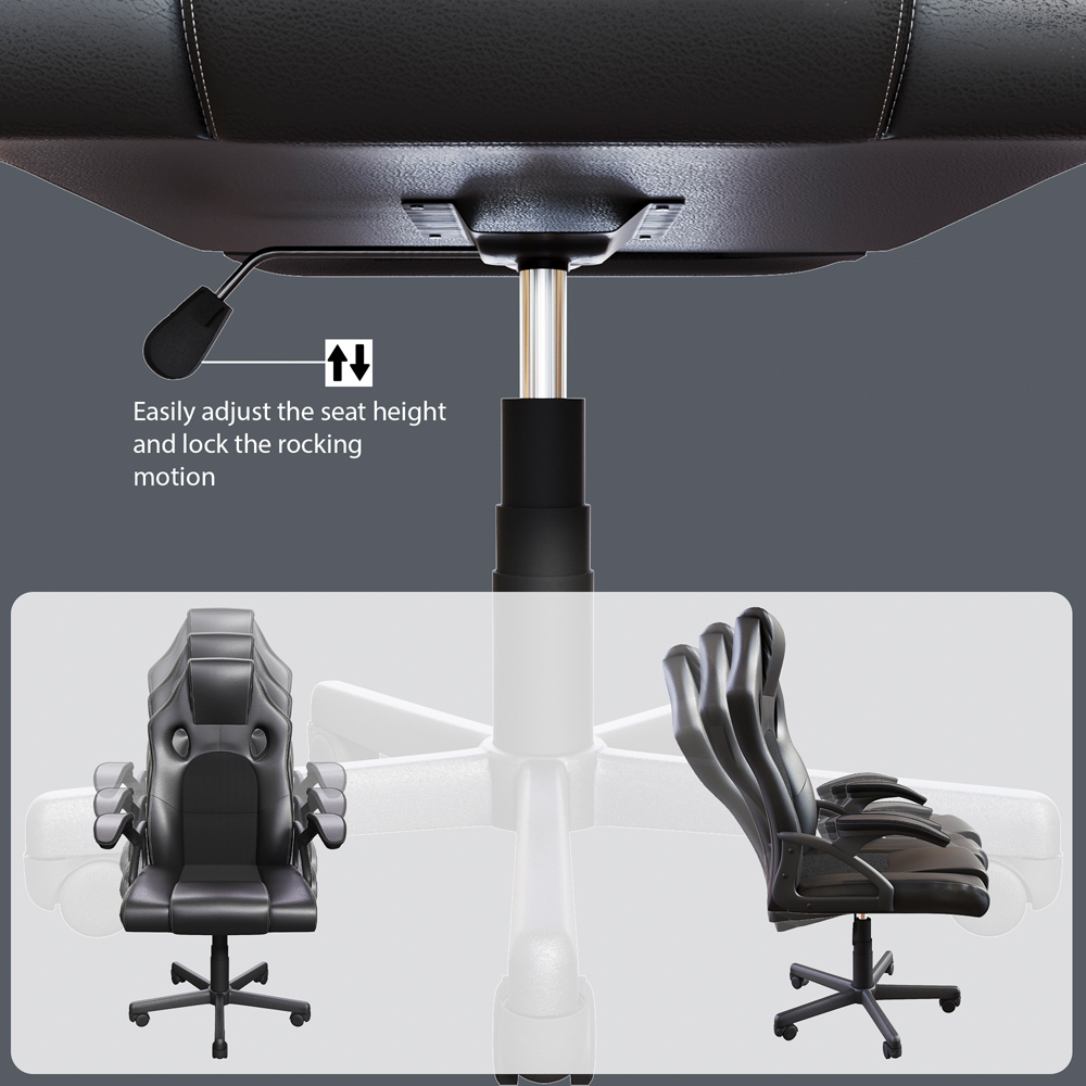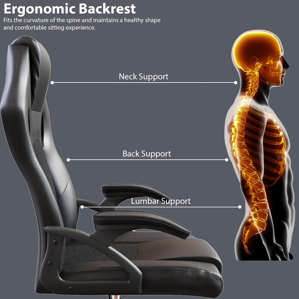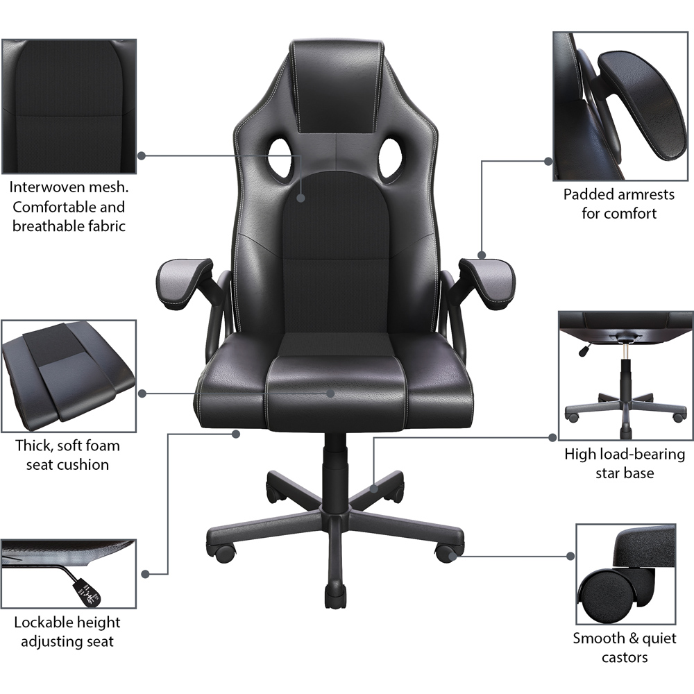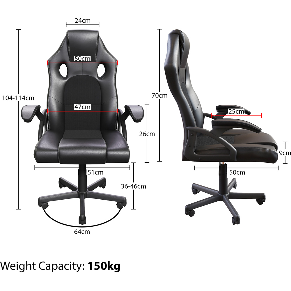 Enhance your gaming experience with the Vida Designs Coma Black Racing Gaming Chair. This superb chair has an elaborate design that is ideal for gaming purposes, workstations and home office spaces. This chair is upholstered using soft PU faux leather and interwoven mesh fabric with a foam-padded seat for ultimate comfort while gaming. This chair has an ergonomic design with a high backrest that supports the back with adjustable height and padded armrests for your convenience. Whether you're aiming for precision shots or coordinating strategies with your team, these armrests offer the comfort and stability you need to stay focused and in control. This chair has a 360° swivel design with castor wheels at the base for easy movement and stable support. The maximum weight limit of this chair is 150kg. This product comes with easy-to-follow instructions for self-assembly. Please note: Due to different devices and screen settings, the colour of the webpage picture you see may have a certain colour difference from the actual product. Size: 64 x 64 x 104 – 114cm.