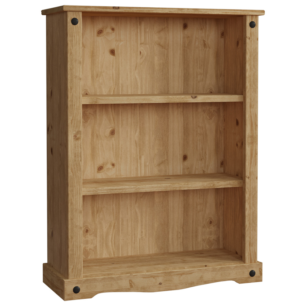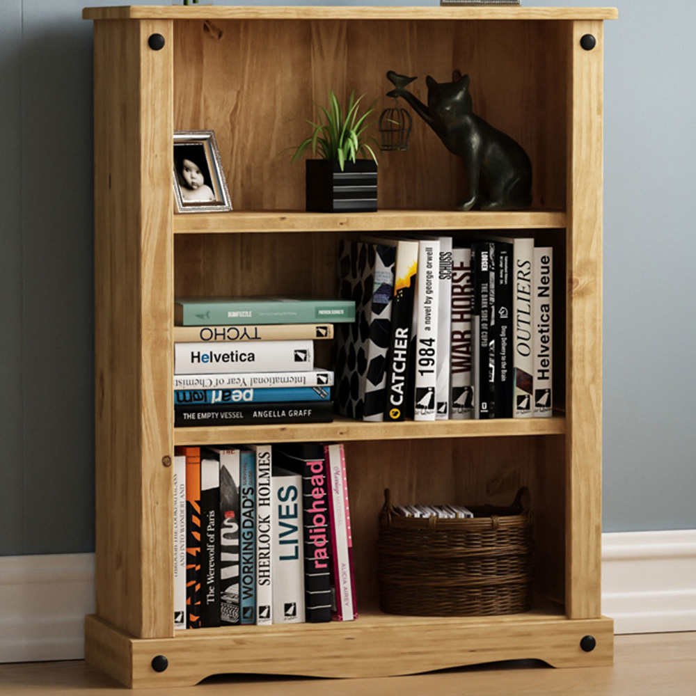 The Vida Designs Corona Low Bookcase in brown is a functional and stylish addition to any home. With its two convenient shelves and compact design, this bookcase is perfect for small spaces. Made from solid pine and finished with distressed wax, it boasts a unique Mexican style that is further accentuated by its decorative black metal studs and attractive base plinth. The wax finish not only protects the wood but also showcases its natural grain. Assembly is straightforward, with detailed instructions included for easy self-assembly at home. Upgrade your storage options with this charming and practical bookcase.