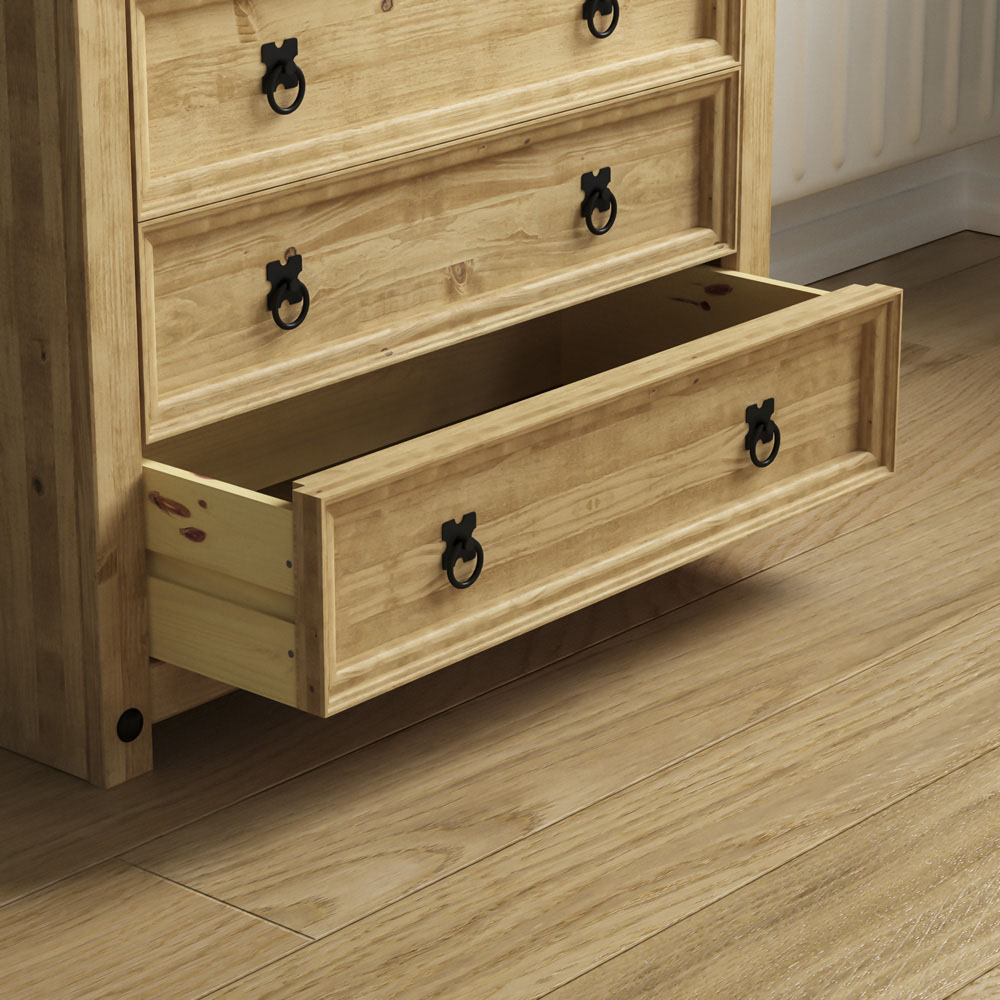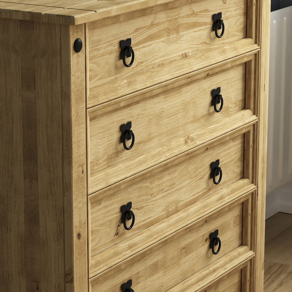 Make a stylish addition to your room with the Vida Designs Corona Rustic 5-Drawer Pine Chest, a perfect blend of rustic charm and practical storage. Crafted from solid wood for durability and a distressed waxed finish, this chest exudes a timeless appeal, creating an inviting atmosphere in any living space. The natural beauty of the wood is enhanced by the distressed effect, adding character and warmth to your home decor. Black metal studs adorn the edges of the chest, elevating its visual appeal and reinforcing its sturdy construction. Featuring five spacious drawers, this chest provides ample storage for all your belongings, from clothing and linens to personal items. The drawers glide smoothly on their tracks, ensuring easy access to your essentials. The top surface of the chest offers additional space for displaying decorative items, framed photos, or a vase of fresh flowers, allowing you to personalize and beautify your living space. Weight Limit: 5kg Per Drawer / 30kg Table Top. Please Note: This item requires self-assembly with easy-to-follow instructions provided. The product's actual colour may vary due to differences in screen display and home lighting.