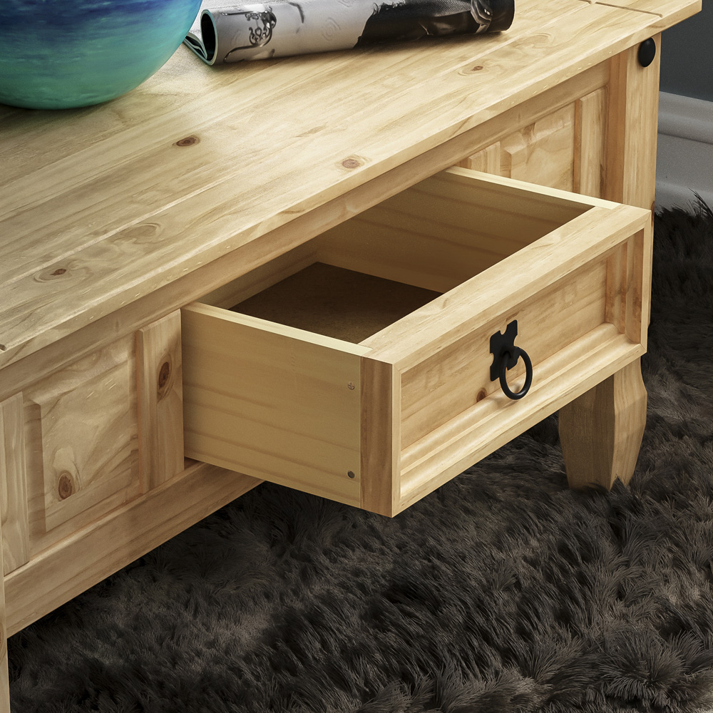 Make a stylish and practical addition to any living room with the Vida Designs Corona 1-drawer Pine Coffee Table. Crafted from high-quality solid wood, this coffee table is designed to withstand the test of time while adding a touch of rustic charm to your home decor. It features a convenient drawer storage system, allowing you to keep your living room essentials organised and easily accessible. The spacious tabletop provides ample surface area for placing your drinks, snacks, or decorative items. The distressed waxed finish adds character and warmth to the wood, giving it a timeless appeal that captures the essence of rustic elegance. The beautiful grain of the wood shines through, adding a touch of nature to your living space. Adorned with black metal studs - this coffee table creates a striking contrast against the rustic wood. Technical specifications: Size: H46 x W94 x D56 cm approximately. Weight limit: 5kg per drawer and 30kg table top. Please note: This item requires self-assembly with easy-to-follow instructions provided.