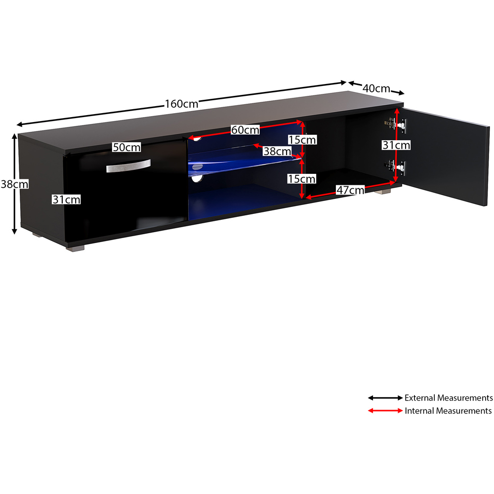 Introducing the Vida Designs Cosmo 2-Door Black LED TV Unit, a stunning and contemporary addition to your living room. This TV unit is designed to enhance your entertainment experience while adding a touch of elegance and style to your space. It features high gloss doors and a matte carcass, creating a visually striking contrast that adds a modern and sophisticated touch to your living room decor. The high gloss doors reflect light beautifully, while the matte carcass provides a sleek and understated backdrop. One of the standout features of the unit is the integrated LED lights. Also, you can customise the LED lights to create a captivating ambience, allowing you to set the mood according to your preferences. So, whether you want a cosy and warm atmosphere or a vibrant and colourful display, the LED lights offer a unique and immersive viewing experience. Spacious, with its glass middle shelf, the unit not only provides a practical storage solution for media devices and accessories but also adds a touch of sophistication. Plus, the glass shelf offers ample space to showcase decorative items or display your favourite collectables, enhancing the overall aesthetic appeal. Designed with functionality in mind, this TV unit has spacious compartments behind the high gloss doors to neatly store your DVDs, gaming consoles, and other media essentials. Crafted with quality materials, the unit ensures durability and longevity, providing a sturdy and reliable platform to support your television and other electronic devices. Lastly, its modern design and sleek finishes make it a versatile choice that seamlessly blends with various interior styles, from contemporary to minimalist. Please Note: This item requires self-assembly with easy-to-follow instructions provided. The actual colour of the product may vary slightly as your screen display setting and lighting with your home environment may differ from our own. Weight Limit: 25kg tabletop and 5kg per shelf.