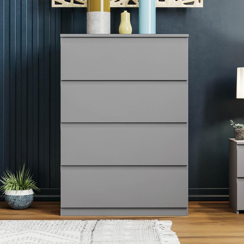 Introducing the Vida Designs Denver 4 Drawer Grey Storage Chest, the perfect addition to any bedroom or living space. Stylish and solid, this chest of drawers is not only durable and long-lasting but adds a touch of elegance to any interior decor. Featuring a handle-free design, the drawers smoothly glide open and close with ease, making it a breeze to access your clothes or other belongings. With four spacious drawers, this chest provides ample storage space for all your essentials. Also, the compact size of this chest of drawers makes it a great solution for smaller spaces, while the simple yet stylish design ensures it matches any interior decor. Please Note: This item requires self-assembly with easy-to-follow instructions provided. The actual colour of the product may vary slightly as your screen display setting and lighting with your home environment may differ from our own. Weight Limit: 5kg per drawer.