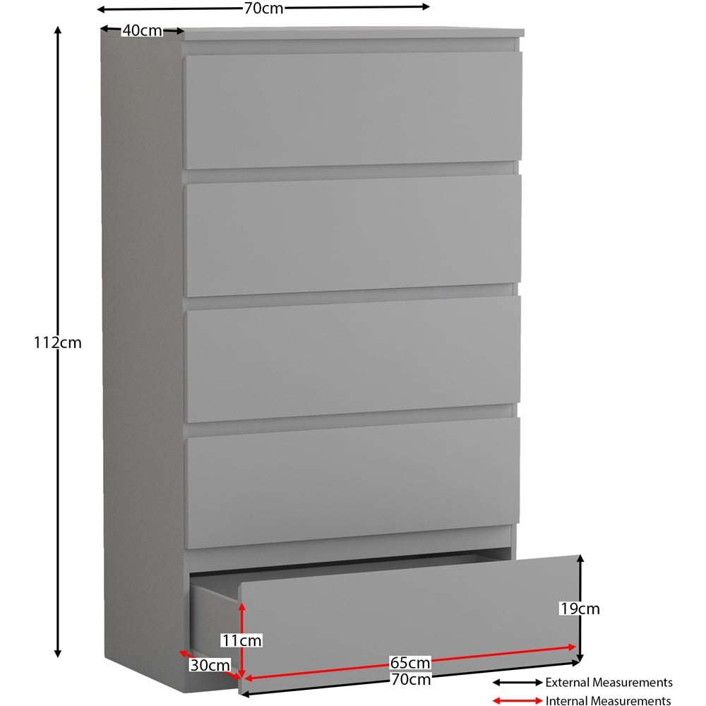 Introducing the Vida Designs Denver 5 Drawer Grey Storage Chest, the perfect addition to any bedroom or living space. Stylish and solid, this chest of drawers is not only durable and long-lasting but adds a touch of elegance to any interior decor. Featuring a handle-free design, the drawers smoothly glide open and close with ease, making it a breeze to access your clothes or other belongings. With five spacious drawers, this chest provides ample storage space for all your essentials. Also, the compact size of this chest of drawers makes it a great solution for smaller spaces, while the simple yet stylish design ensures it matches any interior decor. Please Note: This item requires self-assembly with easy-to-follow instructions provided. The actual colour of the product may vary slightly as your screen display setting and lighting with your home environment may differ from our own. Weight Limit: 5kg per drawer.