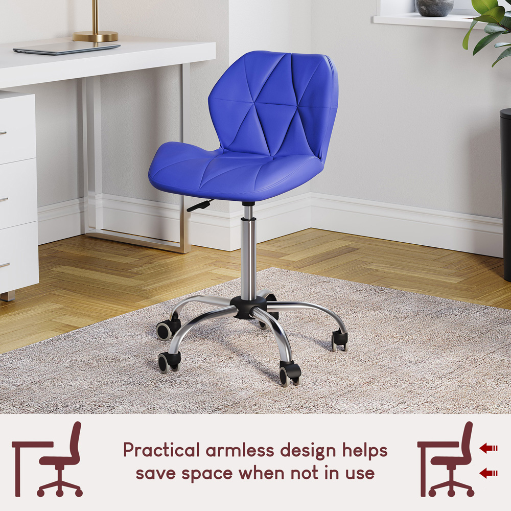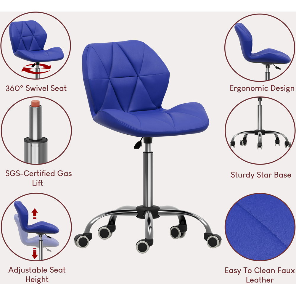 The Vida Designs Geo Office Chair in blue is a stylish and comfortable addition to your workspace. Made from high-quality PU faux leather, this chair is durable and easy to clean. The seat is cushioned with quality padding for extra comfort, making it ideal for long working hours. The chair can be adjusted to your desired height using the gas lift mechanism, allowing you to find the perfect seating position. With its modern design and practical features, this chair is the perfect choice for any office environment.