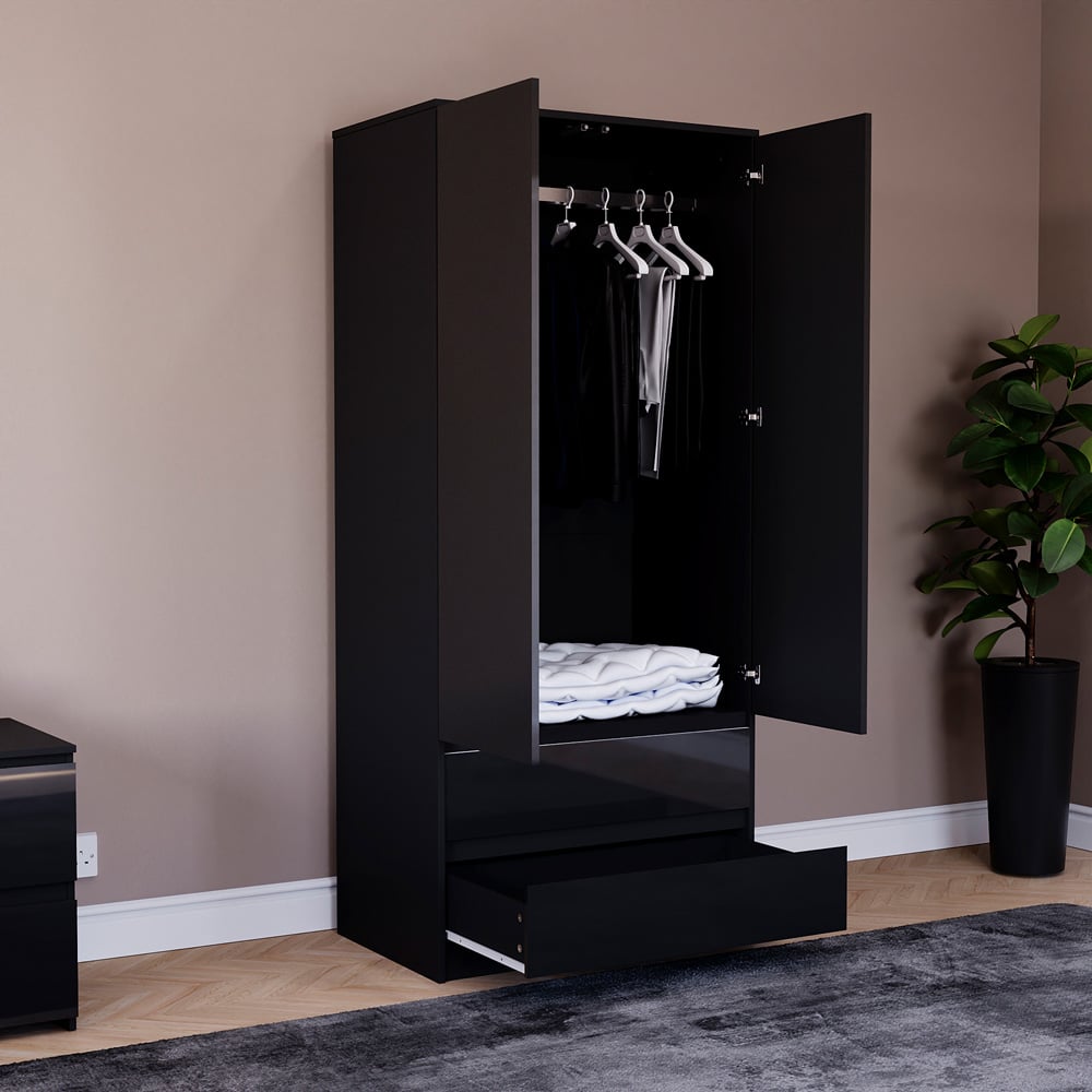 Step into a world of elegance with the Vida Designs Glinton 2 Door 2 Drawer Black Wardrobe. This stylish wardrobe is constructed from 100% FSC-certified engineered wood, ensuring sustainability without compromising durability. The UV and melamine finish provides a resilient structure that resists scratches, moisture, and everyday wear and tear while maintaining a sleek and modern appearance. The spacious interior behind the two doors provides ample hanging and shelving space for clothing, while the two lower drawers are perfect for storing accessories, bed sheets, or other essentials. Its handleless design adds a contemporary touch and enhances safety, eliminating the risk of getting hurt by handles that are sticking out.