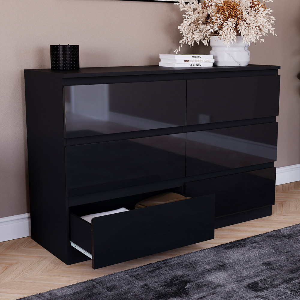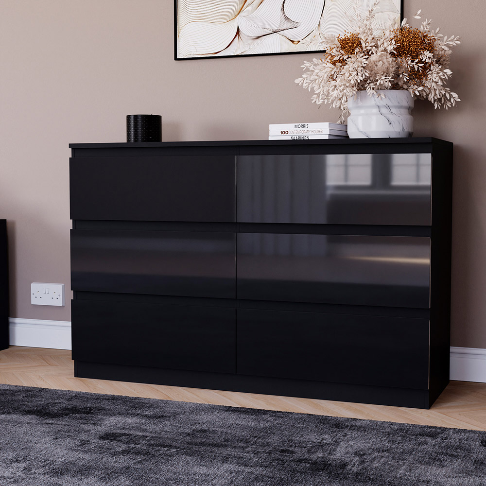 Bring style and organization to your bedroom with the Vida Designs Glinton 6 Drawer Black Chest of Drawers. This stylish chest is constructed from 100% FSC-certified engineered wood, ensuring sustainability without compromising durability. The UV and melamine finish provides a resilient structure that resists scratches, moisture, and everyday wear and tear while maintaining a sleek and modern appearance. With six spacious pull-out drawers, this chest provides ample storage for essentials, keeping your items organised and easily accessible. Its handleless design enhances the clean, minimalist aesthetic while adding a layer of safety by eliminating protruding handles, reducing the risk of accidental bumps and injuries. The flat top serves as a practical surface for lamps, books, or personal items, contributing to a tidy and inviting atmosphere.