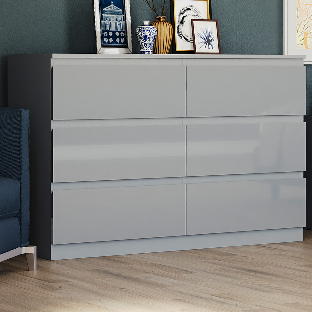 Bring style and organization to your bedroom with the Vida Designs Glinton 6 Drawer Grey Chest of Drawers. This stylish chest is constructed from 100% FSC-certified engineered wood, ensuring sustainability without compromising durability. The UV and melamine finish provides a resilient structure that resists scratches, moisture, and everyday wear and tear while maintaining a sleek and modern appearance. With six spacious pull-out drawers, this chest provides ample storage for essentials, keeping your items organised and easily accessible. Its handleless design enhances the clean, minimalist aesthetic while adding a layer of safety by eliminating protruding handles, reducing the risk of accidental bumps and injuries. The flat top serves as a practical surface for lamps, books, or personal items, contributing to a tidy and inviting atmosphere.