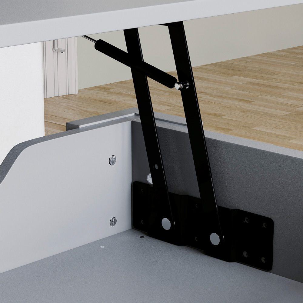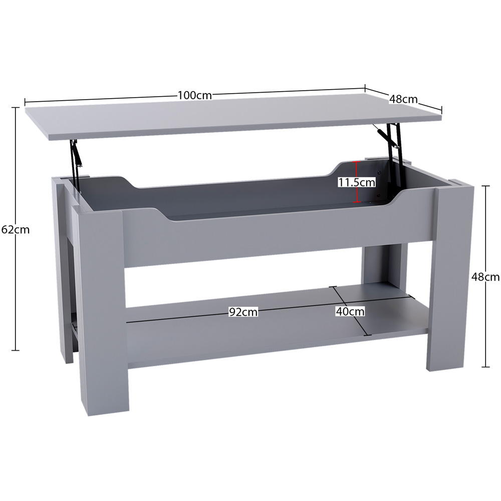 Make a beautiful addition to your living space with this Vida Designs Grey Lift Up Coffee Table. This contemporary coffee table has a sleek design and surprises with its lift-up tabletop, revealing a hidden storage compartment for all your living room essentials. Constructed with particleboard, this coffee table is more than just a stylish surface. The lift-up mechanism transforms your table into a versatile workstation or a convenient spot for snacking and reading. The hidden storage beneath adds a touch of organization to your living space, keeping clutter out of sight. The weight limit for this table is ten kg per shelf. In addition to the lift-up feature, this coffee table boasts a convenient underneath shelf, providing additional space to showcase decorative items or store frequently used items within easy reach. The combination of form and function makes this piece a must-have for your home. Please note - The product's actual colour may vary slightly as your screen display setting and lighting with your home environment may differ. Also, it requires self-assembly and comes with easy-to-follow instructions. Measurements: H48 x W100 x D48cm.