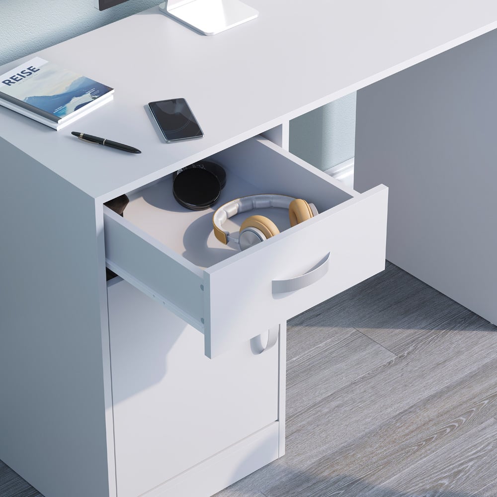 The Vida Designs Hudson Computer Desk in white is a stylish and functional addition to any home office. This desk offers a spacious work surface for your computer and other office essentials. The sleek design and neutral colour make it a great fit for any decor style. In addition to the ample desk space, this desk also features a sliding drawer and a cabinet with two shelves, providing ample storage for your documents, office supplies, and other items. Whether you are working from home or just need a dedicated space for your computer, the Hudson Computer Desk is an excellent choice.