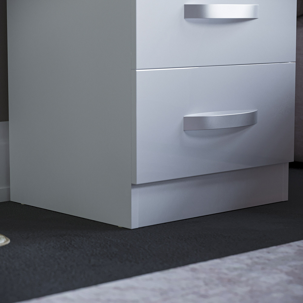 Sleek yet practical, this Hulio Bedside Cabinet from Vida Designs will make a perfect addition to your modern and stylish bedroom decor! Made from high-quality MDF and particle board with a white finish, this bedside cabinet features high gloss drawers and a matte carcass for a unique and contemporary look. With two spacious drawers, this cabinet provides ample storage space for your books, accessories, and other essentials. The stainless steel handles add a touch of elegance to the overall design, while also making it easy to open and close the drawers. Material: MDF and Particle Board. Finish: Melamine, Paper Veneer and High Gloss. Weight Limit: 5kg Per Drawer. Note: This item requires self-assembly with easy-to-follow instructions provided. The actual colour of the product may vary slightly as your screen display setting and lighting with your home environment may differ.
