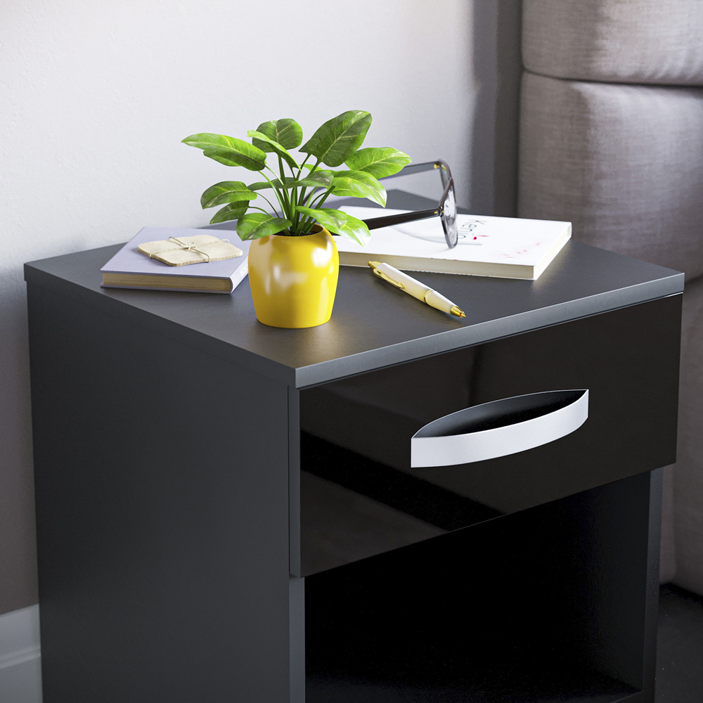 Sleek yet practical, this Hulio Bedside Cabinet from Vida Designs will make a perfect addition to your modern and stylish bedroom decor! Made from high-quality MDF and particle board with a black finish, this bedside cabinet features high gloss drawers and a matte carcass for a unique and contemporary look. With a spacious drawer and a bottom shelf, this cabinet provides ample storage space for your books, accessories, and other essentials. The stainless steel handle adds a touch of elegance to the overall design, while also making it easy to open and close the drawers. Material: MDF and Particle Board. Finish: Melamine, Paper Veneer and High Gloss. Weight Limit: 5kg Per Shelf and 5kg Per Drawer. Note: This item requires self-assembly with easy-to-follow instructions provided. The actual colour of the product may vary slightly as your screen display setting and lighting with your home environment may differ.