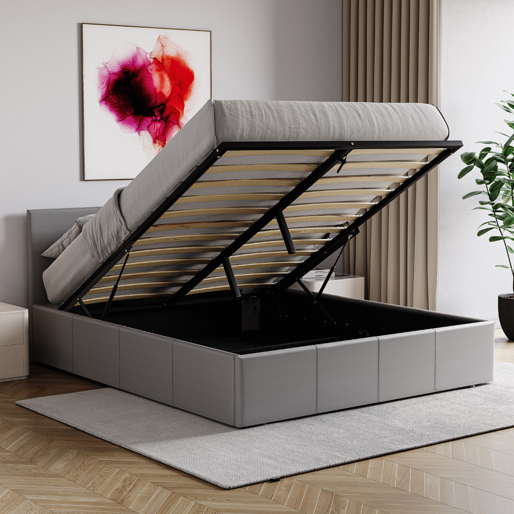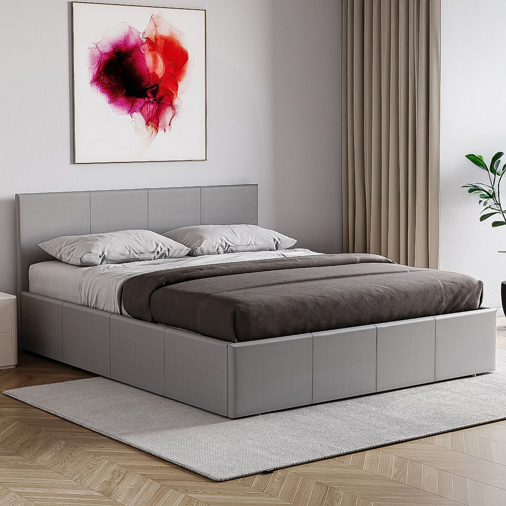 The Vida Designs Lisbon Double Grey Ottoman Faux Leather Bed is a perfect combination of style, functionality, and comfort. Upholstered in luxurious faux leather, this bed exudes sophistication and adds a touch of elegance to your bedroom decor. With its modern design and clean lines, the Faux Leather Ottoman Bed effortlessly enhances the contemporary aesthetic of your bedroom. It serves as a stylish centrepiece that complements any interior style, creating a visually pleasing and harmonious atmosphere. One of the standout features of this bed is its practicality. The ottoman design allows for discreet and ample storage space beneath the mattress. The easy-lift hydraulic mechanism provides effortless access to the hidden storage area, where you can conveniently store extra bedding, pillows, or other personal belongings, keeping your bedroom clutter-free and organized. Equipped with a slatted base, the Faux Leather Ottoman Bed offers excellent support and ventilation for your mattress, ensuring a comfortable and restful sleep. The slatted design promotes air circulation, helping to maintain a hygienic sleeping environment. Crafted with attention to detail and quality materials, this bed is built to last. The sturdy frame and durable upholstery guarantee long-term stability and reliability, making it a worthwhile investment for your bedroom. In addition to its functionality and durability, the Faux Leather Ottoman Bed provides an extra level of comfort with its upholstered headboard. The padded headboard offers a cosy and supportive surface for you to lean against while enjoying a book or watching TV, making your bed a comfortable and inviting space. Weight Limit: 200kg. Please Note: This item requires self-assembly with easy-to-follow instructions provided. The actual colour of the product may vary slightly as your screen display setting and lighting with your home environment may differ from our own.