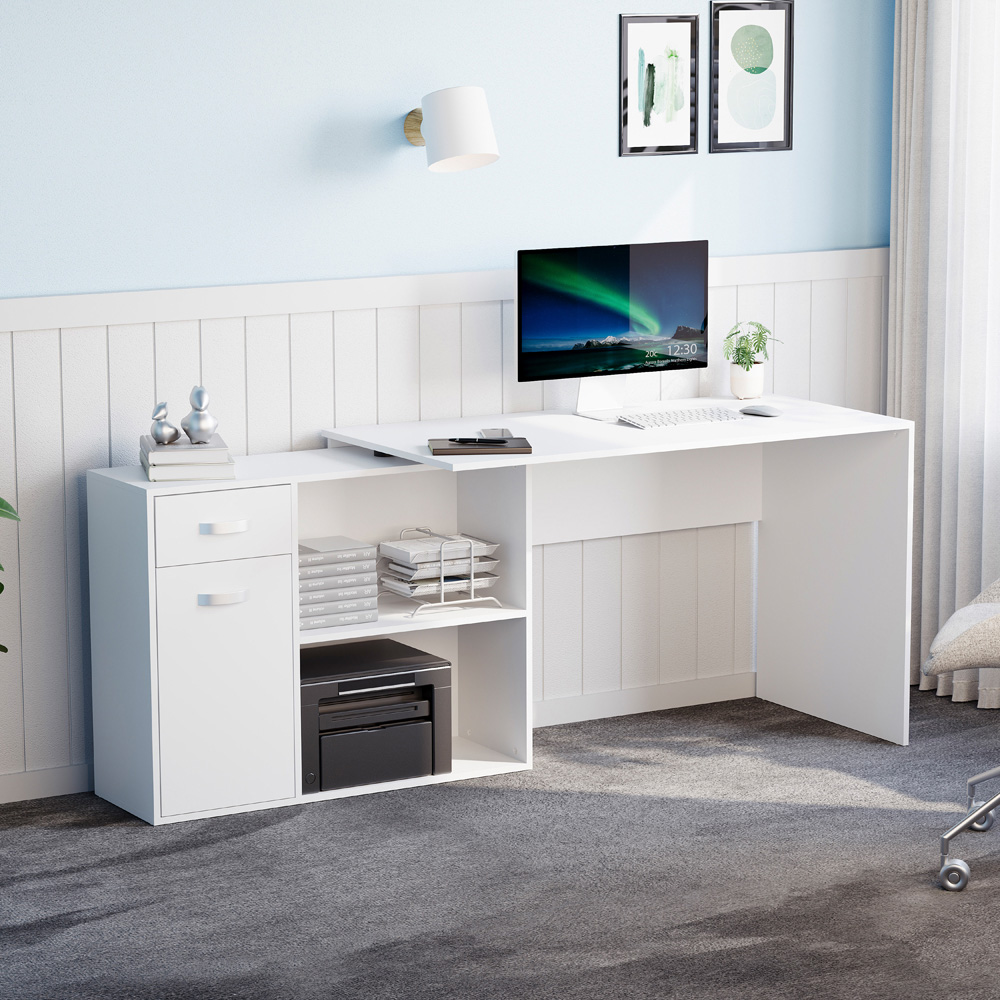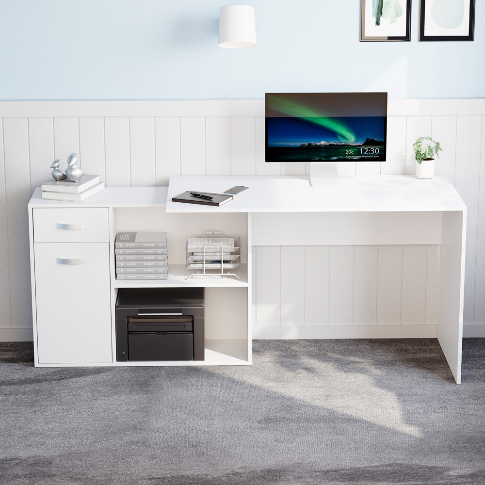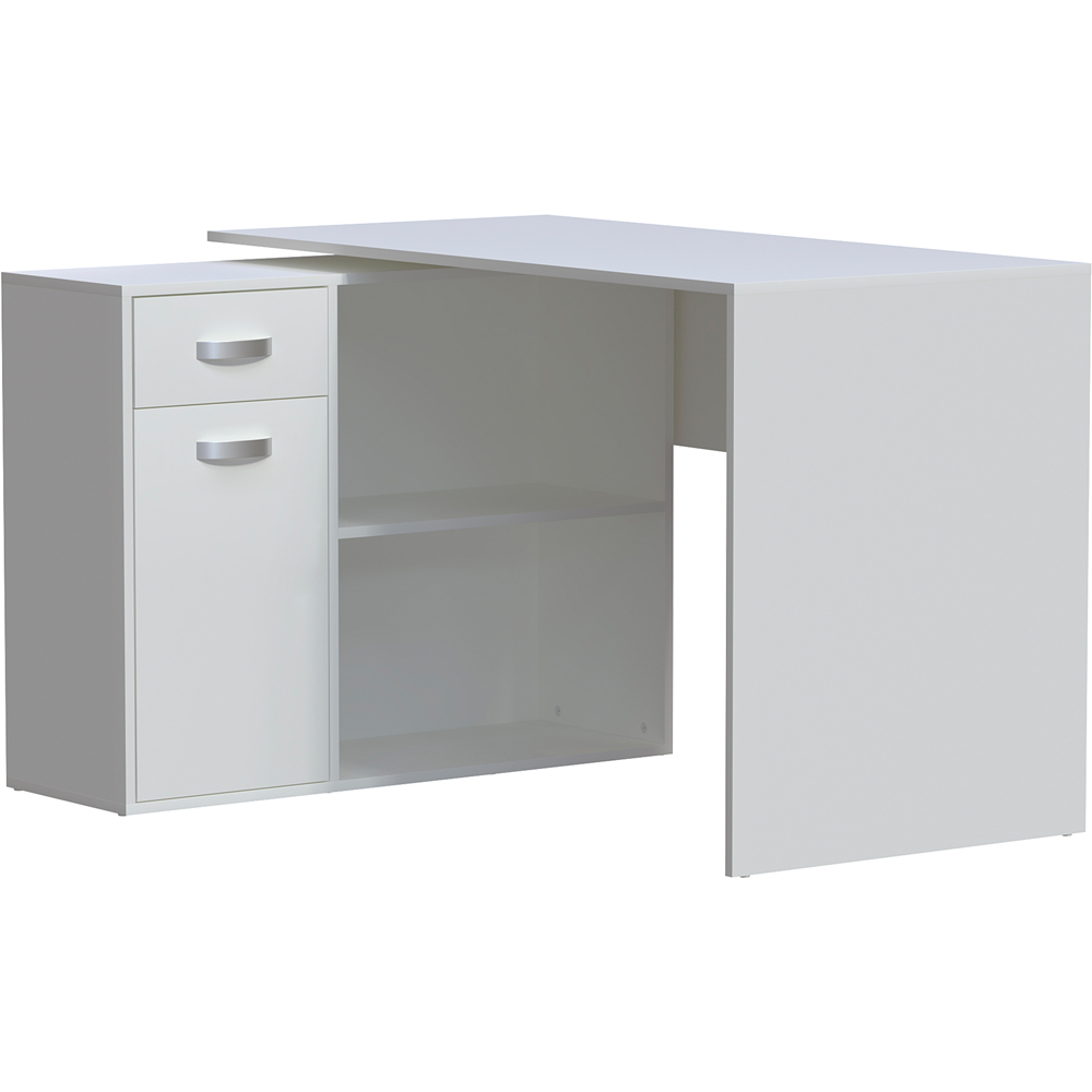 The Vida Designs Longton Adjustable Computer Desk is a versatile and functional piece of furniture, perfect for both home and office use. It features two open shelves, one sliding drawer and one cabinet, providing ample storage for your personal items. This desk is designed with versatility in mind and can be used as either a flat wall desk or an L-shaped corner desk, making it a great option for those with limited space. The sleek and modern design of this desk will add a touch of style to any room.
