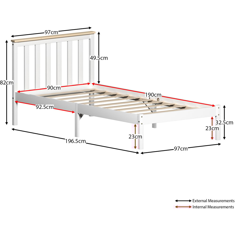 Introducing the Vida Designs Milan Single White and Pine Low Foot Wooden Bed Frame, a timeless and charming addition to your bedroom. Crafted from solid pine, this bed frame offers durability and strength, ensuring a reliable and long-lasting sleep solution. It features a classic design with its vertical slatted headboard, evoking a sense of traditional style and sophistication. The clean lines and graceful silhouette of the bed frame make it a versatile choice that effortlessly complements various bedroom decors. Designed for both comfort and support, the bed has a slatted base that provides excellent mattress support and promotes proper air circulation. Embracing the timeless shaker style, the bed frame adds a touch of understated elegance to any bedroom setting. Assembly of this bed frame is straightforward, thanks to the included instructions and hardware. Also, with its sturdy construction and attention to detail, this bed frame is designed to provide a stable and secure foundation for your mattress. Please Note: This item requires self-assembly with easy-to-follow instructions provided. The actual colour of the product may vary slightly as your screen display setting and lighting with your home environment may differ from our own. Weight Limit: 120kg.