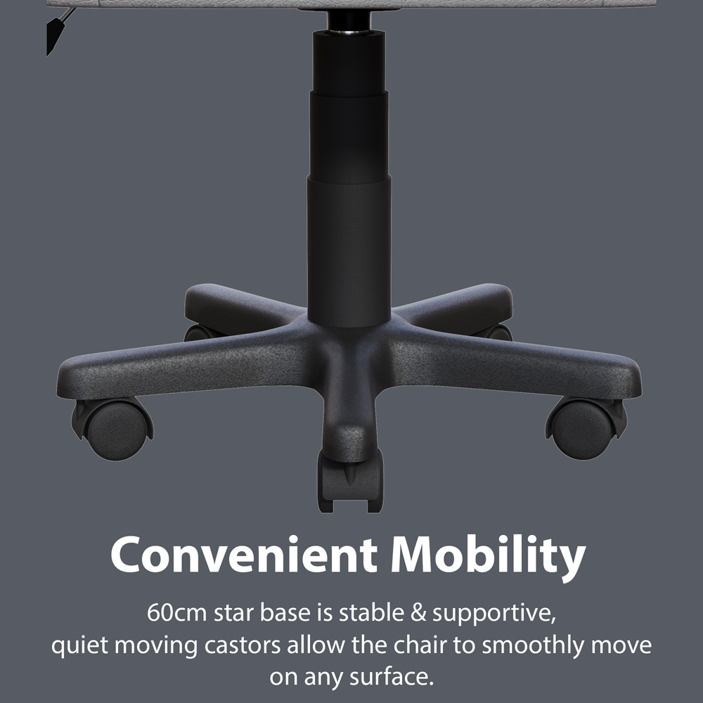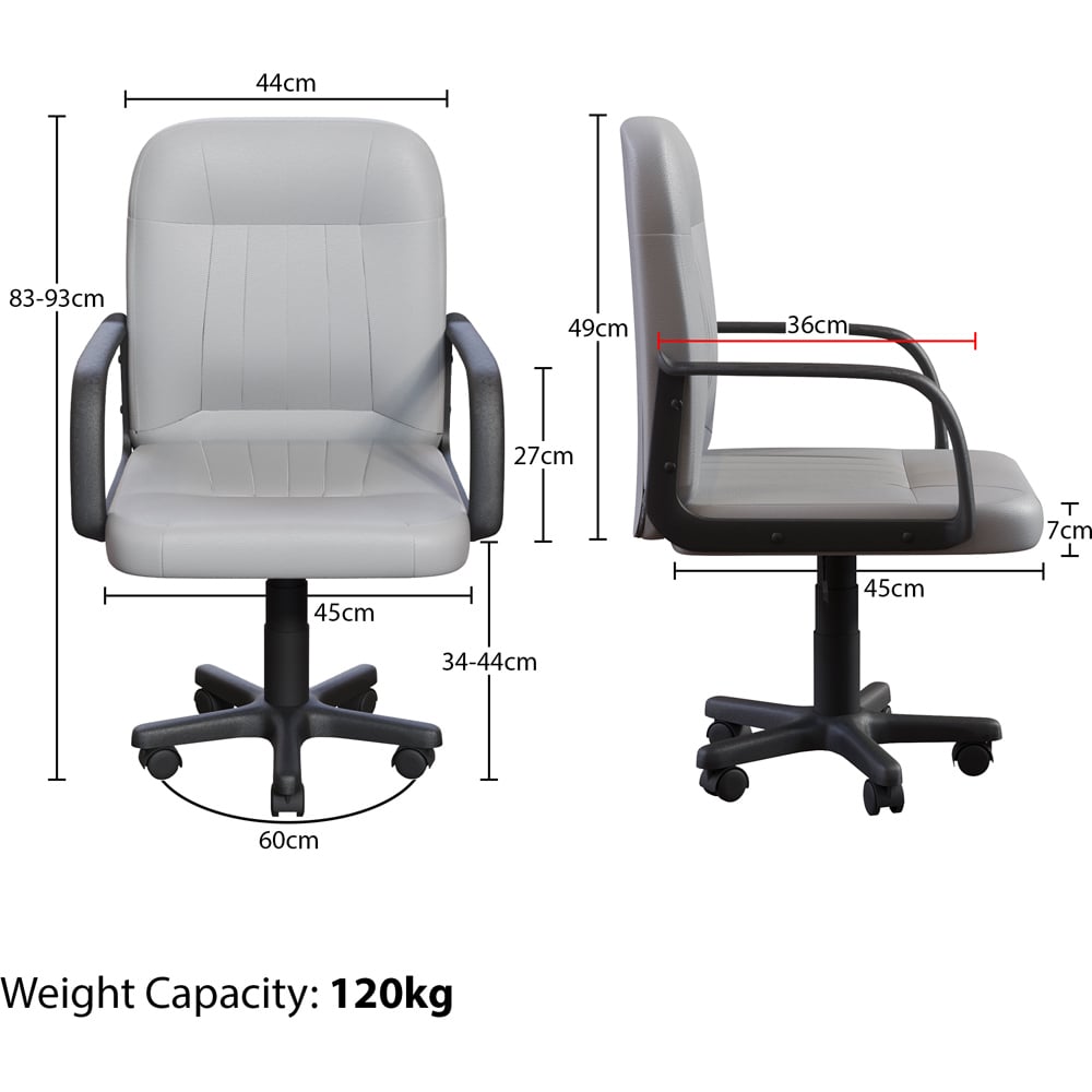 Add a classy touch to your workspace with the Vida Designs Morton Grey Office Chair. This sleek chair has an exquisite design that is ideal for conference rooms, workstations and home office spaces. The cosy foam-padded seat is upholstered using soft faux leather with a firm backrest for ultimate comfort. This chair has an ergonomic design that supports the back with sturdy armrests and 83 to 93cm adjustable height for your convenience. It also features a 360-degree swivel design with castor wheels at the base for easy movement and stable support. The maximum weight limit of this chair is 120kg. This product comes with easy-to-follow instructions for self-assembly. Please note: Due to different devices and screen settings, the colour of the webpage picture you see may have a certain colour difference from the actual product. Size: 60 x 60 x 83 - 93cm.