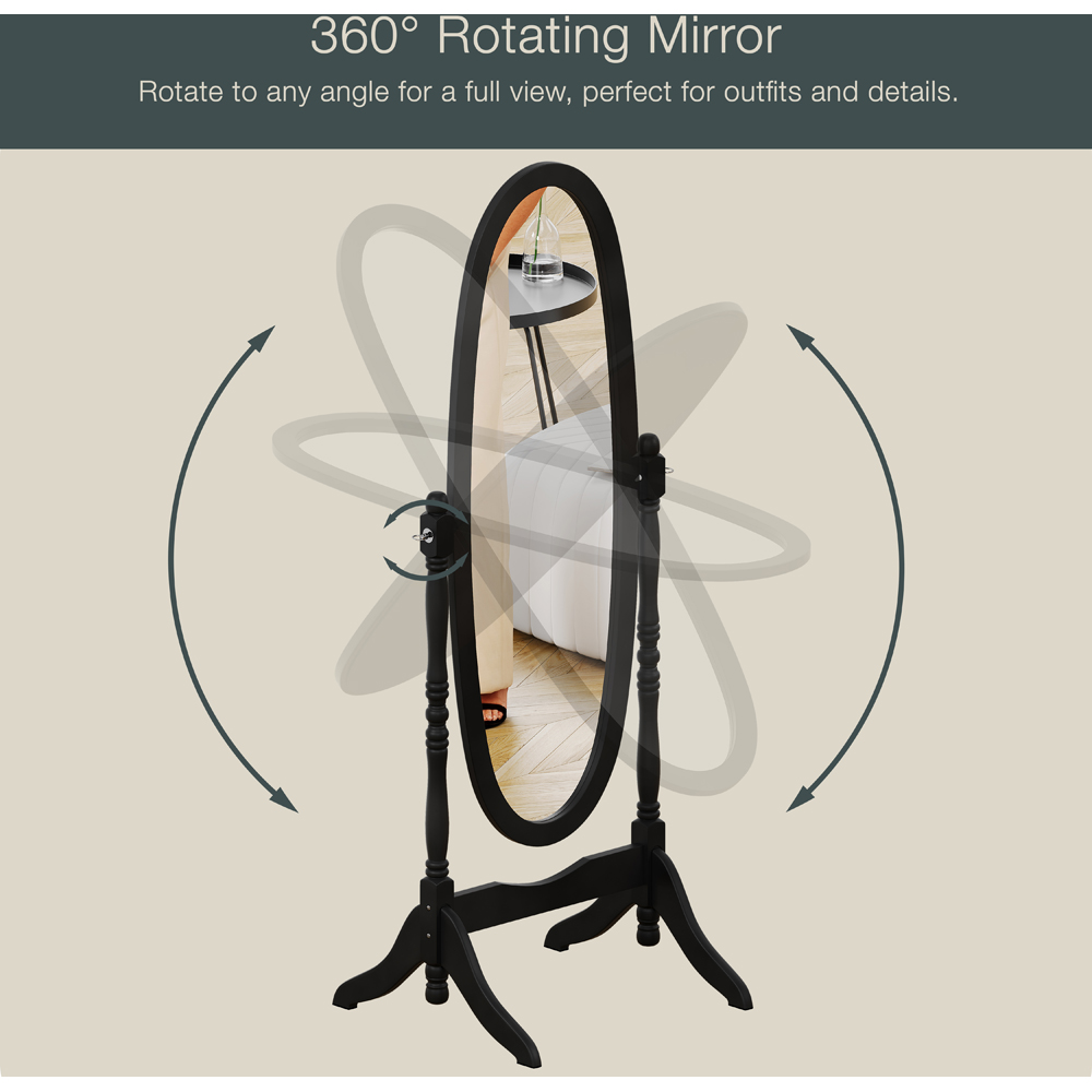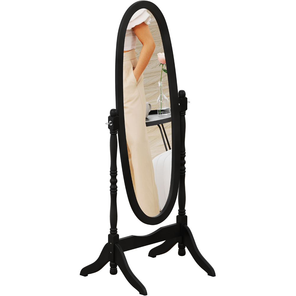 This classically designed standing mirror will perfectly complement a variety of different decor schemes in its sleek black finish. This cheval mirror can be swivelled, making it ideal for everything from doing your make-up to assessing your whole outfit. The mirror excellently combines practicality and supreme beauty being made from strong and durable MDF with a pretty and sleek black finish.Requires self assembly.This item is also available in white.