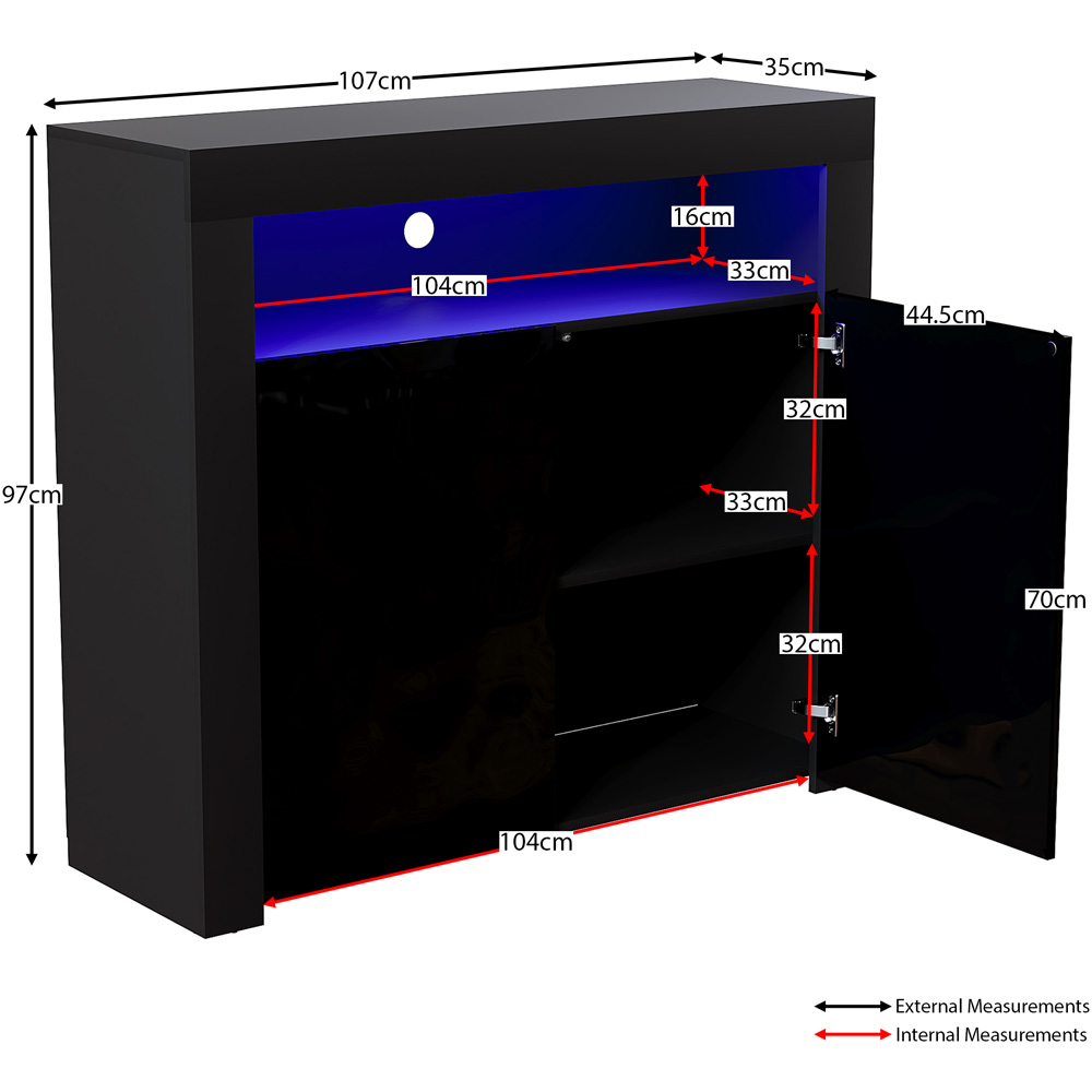 Introducing the Vida Designs Nova 2 Door Black LED Sideboard, a stylish and versatile storage solution. This sideboard is designed to elevate your living space and provide ample storage for your belongings. The standout feature of the sideboard is the LED lights, which add a touch of sophistication and modernity to your room. The subtle illumination creates a warm and inviting ambience, making it a perfect addition to your dining area or living room. Its high gloss doors and matte carcass create a visually striking contrast, giving the sideboard a sleek and polished appearance. The combination of glossy and matte finishes adds depth and dimension to the design, making it an eye-catching focal point in any room. With an internal shelf, you can organise your belongings efficiently and keep them neatly tucked away. So, whether it's your fine china, table linens, or other essentials, the internal shelf provides a convenient space to store and access your items. In addition to the internal shelf, the sideboard features a display shelf where you can showcase your favourite decor pieces, family photos, or cherished collectables. This display shelf adds a personal touch to the sideboard, allowing you to personalize and decorate it according to your style. Plus, its sturdy construction and reliable hardware make it a practical storage solution for years to come. Please Note: This item requires self-assembly with easy-to-follow instructions provided. The actual colour of the product may vary slightly as your screen display setting and lighting with your home environment may differ from our own. Weight Limit: 10kg per shelf.