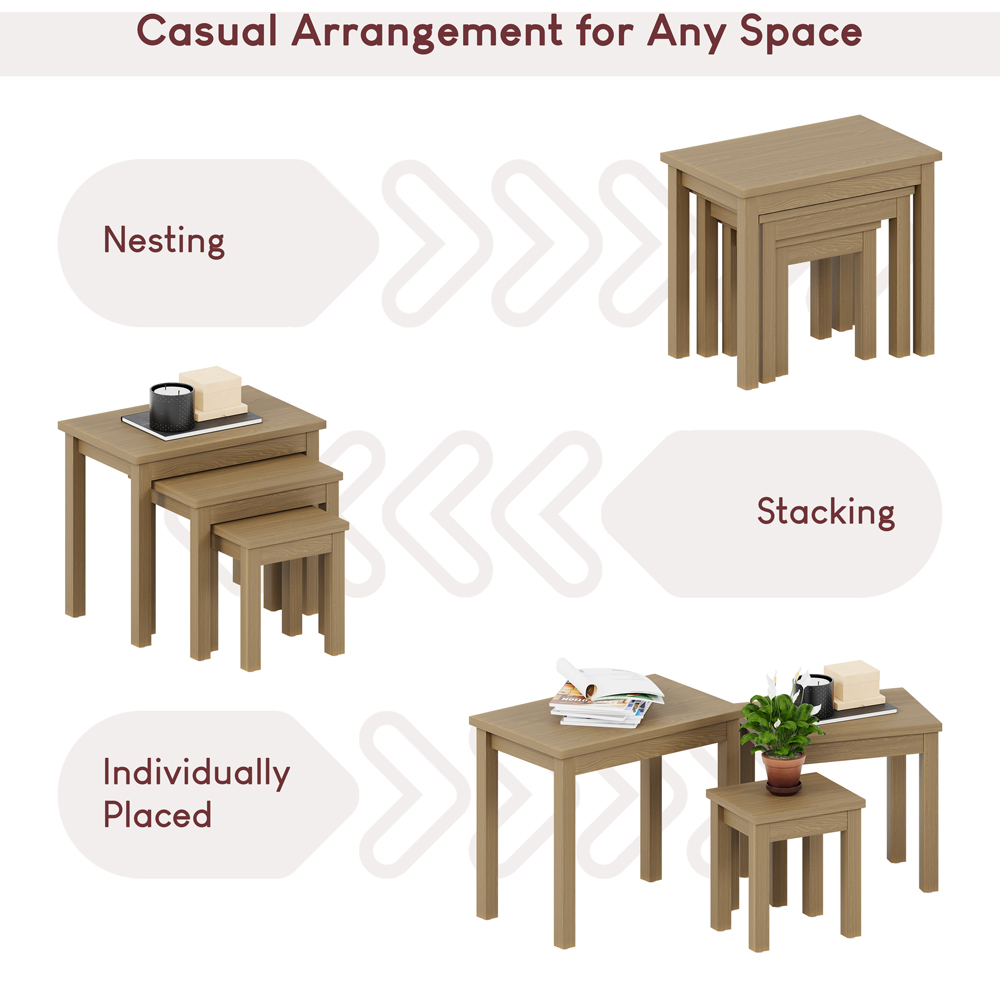 Add a touch of warmth to any room with the Vida Designs Oakridge Pine Nest of Tables Set of 3. This set of three tables provides a versatile solution - featuring spacious table tops that offer ample room for your daily essentials, decor, or even your favourite reads. With rich oak veneer finish - it exudes a natural charm, adding a touch of warmth to any room. The clean and timeless design allows these tables to seamlessly blend into a variety of interior styles. Their freestanding nature ensures you can effortlessly adapt your space to suit your evolving needs. Elevate your living space with the understated luxury of wood craftsmanship and unlock the potential for creative interior styling. Technical specification: Large table: H47 x W54 x D34cm approximately. Medium table: H40 x W41 x D29cm approximately. Small table: H32 x W29 x D24cm approximately. Weight limit: 10kg per table. Please note: This item requires self-assembly with easy-to-follow instructions provided.