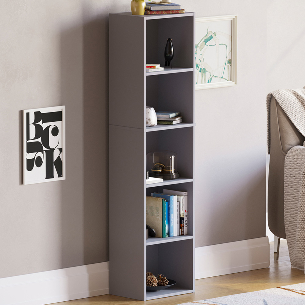 The Vida Designs Oxford 5-Tier Grey Bookcase in Walnut is a practical and stylish storage solution for your home or office. This bookcase features five spacious shelves that are made from durable MDF material and finished in a sleek grey colour. The sturdy construction ensures that your items will be secure on the shelves, and the bookcase is built to last. Whether you're looking to store and display your books, decorative items, or other possessions, the Oxford 5-Tier Cube Bookcase in Grey is an ideal choice.