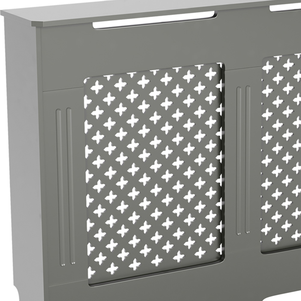 The Vida Oxford Medium Radiator Cover in grey is a stunning and modern product that will effortlessly elevate the style of your home. Crafted with attention to detail, this radiator cover boasts a sleek grey finish that complements any interior decor. Featuring a traditional cross-grill pattern design, this radiator cover exudes elegance and adds a touch of vintage charm to your home. The rounded edges lend a soft touch to the overall design, making it a perfect addition to any room. It also features a convenient top shelf that can be used to display decorative items, store books, or any other essentials. This small-sized cover is perfect for compact spaces. It's easy to assemble and comes with instructions for hassle-free installation. External Measurements: H 82 x W 111 x D 19cm approx. Internal Measurements: H 80 x W 102 x D 16cm approx.