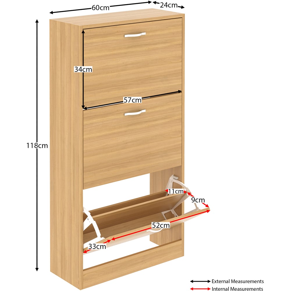 Declutter in style with this gorgeous shoe cabinet in a natural pine effect finish. Not only does this shoe cabinet look effortlessly stylish, it's also the perfect piece of furniture to keep your footwear organised. Made from strong and durable MDF, this cabinet features three pull-down drawers with slick aluminium handles. This shoe cabinet is also available in walnut and black, and walnut and white.