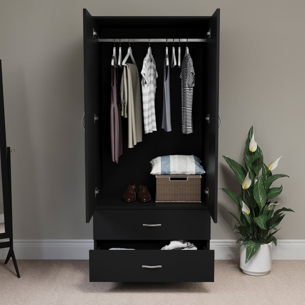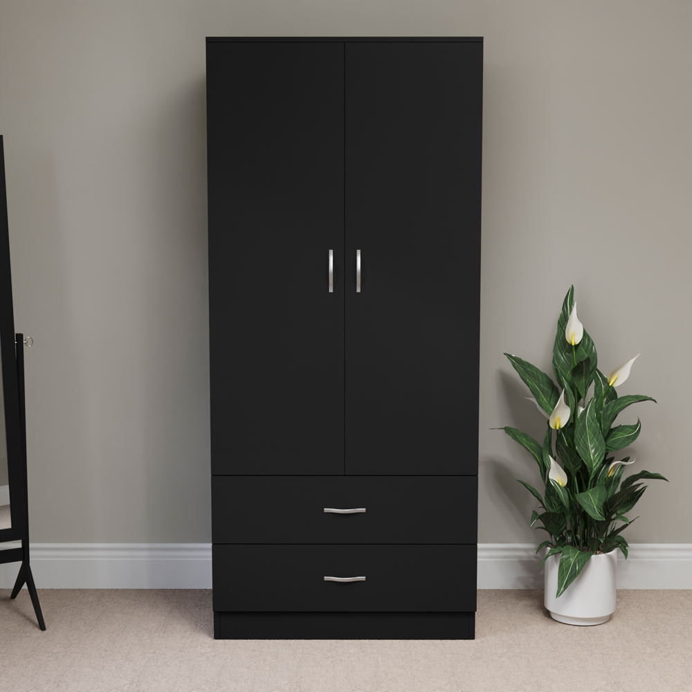 The Riano 2 Door 2 Drawer Wardrobe is a stylish and practical storage solution designed to complement modern interiors. Crafted from durable MDF and particleboard, it features a sturdy construction enhanced by a sleek paper veneer and melamine finish, ensuring longevity and a contemporary look. This wardrobe seamlessly blends with a variety of decor styles. Behind its two spacious doors lies ample hanging space, perfect for keeping your clothes organised and crease-free. Additionally, the two pull-out drawers offer generous storage for folded clothing, accessories, jewellery, makeup and more, making it a functional and attractive addition to any bedroom.