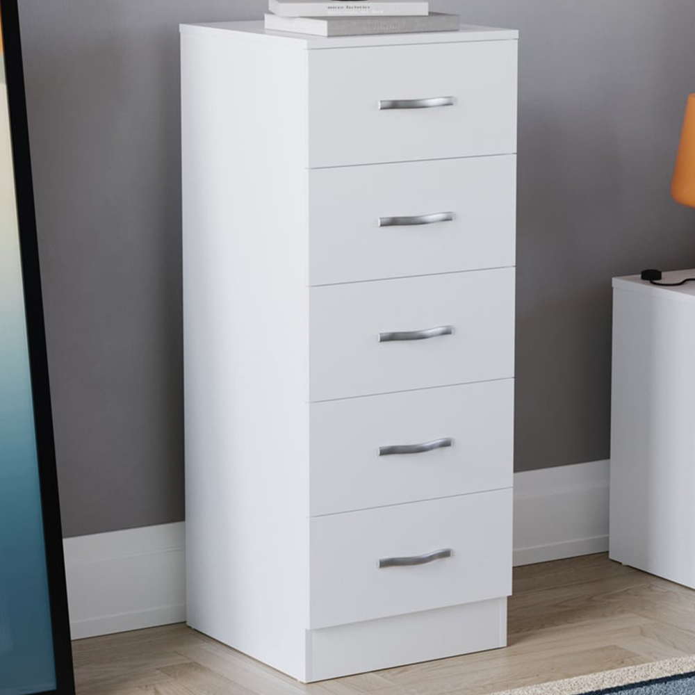 The Vida Designs Riano 5 Drawer White Narrow Chest offers the perfect storage solution for any room! Featuring a sleek white finish and made from high-quality MDF and particle board, this chest of drawers is not only durable and sturdy but also adds a touch of sophistication to any interior decor. With five spacious drawers and stainless steel handles, this chest provides ample storage space for your clothes, accessories, and other essentials. The compact size makes it a great solution for smaller rooms or apartments, while the versatile design ensures it matches any interior decor. The combination of MDF and particle board creates a strong and stable structure, ensuring long-lasting use. The stainless steel handles add a modern touch to the classic design, making it a great addition to any bedroom or living space. Weight Limit: 5kg Per Drawer. Please Note: This item requires self-assembly with easy-to-follow instructions provided. The actual colour of the product may vary slightly as your screen display setting and lighting with your home environment may differ from our own.